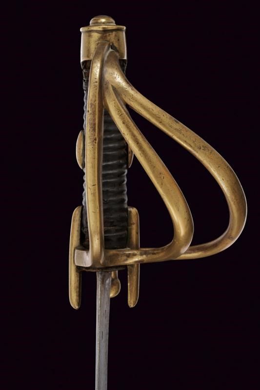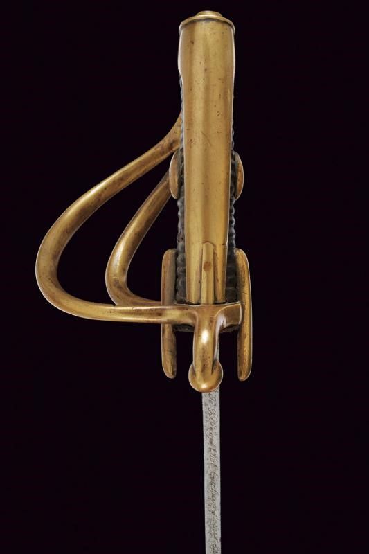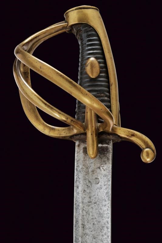 Francia, lunghezza 102 cm. primo quarto del XIX Sec. Larga lama curva a un filo e breve controfilo recante ampio sguscio e breve tallone; alla base due punzoni non chiaramente leggibili (un forse N, l'altro LW). Al dorso M.f.ture du Klingenthal Coulaux Freres Entrep.rs. Fornimento in ottone. Alette fermafodero bombate, guardia a tre rami a la chasseur e cappetta lunga. Il ramo di guardia principale timbrato RJ sotto corona e con un altro marchio non leggibile. Impugnatura in legno con rivestimento in manico di cuoio (qualche mancanza e difetti) senza trecciola. Fodero in ferro (con varie mancanze e intaccature) a due campanelle.