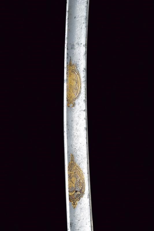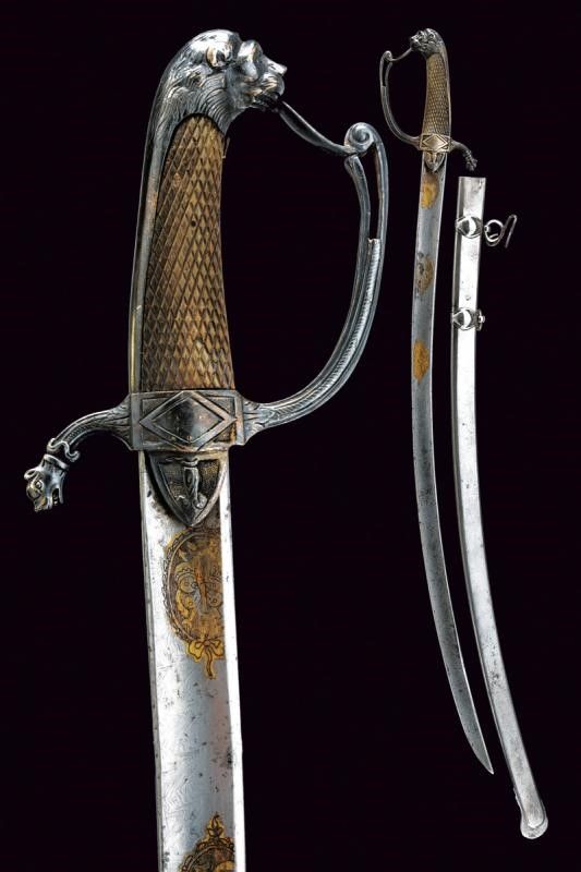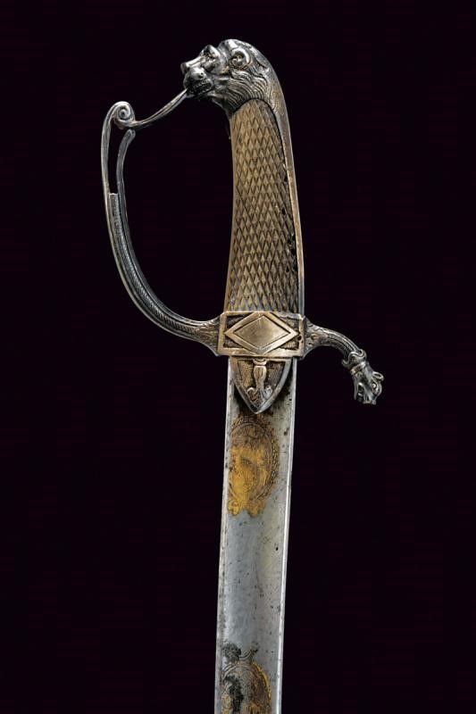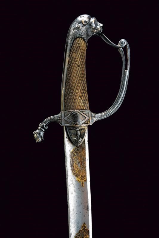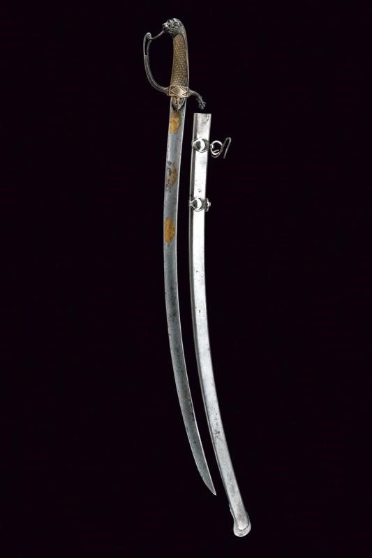 Prima metà del XIX Secolo Lama curva a un filo e breve controfilo, ampiamente sgusciata, tutta la superficie lavorata a imitare il damasco, recante al forte su entrambe le facce tre medaglioni con tracce di doratura effigianti vari emblemi quali, teste di turco, trofei d'armi e bandiere, mezzelune e soli antropomorfi. Il fornimento in argento. Massello con piccole alette fermafodero cuspidate e decorate con fregio in rilievo su sfondo puntinato. Massello inciso a rombo. Guardia con decoro parzialmente traforato e con elemento sommitale controcurvato. Braccio di parata culminante a testa di lupo. Cappetta lunga con calotta a testa di leone. Impugnatura in corno zigrinato. Fodero non pertinente, all'austriaca, in ferro a due campanelle su fascette bombate.