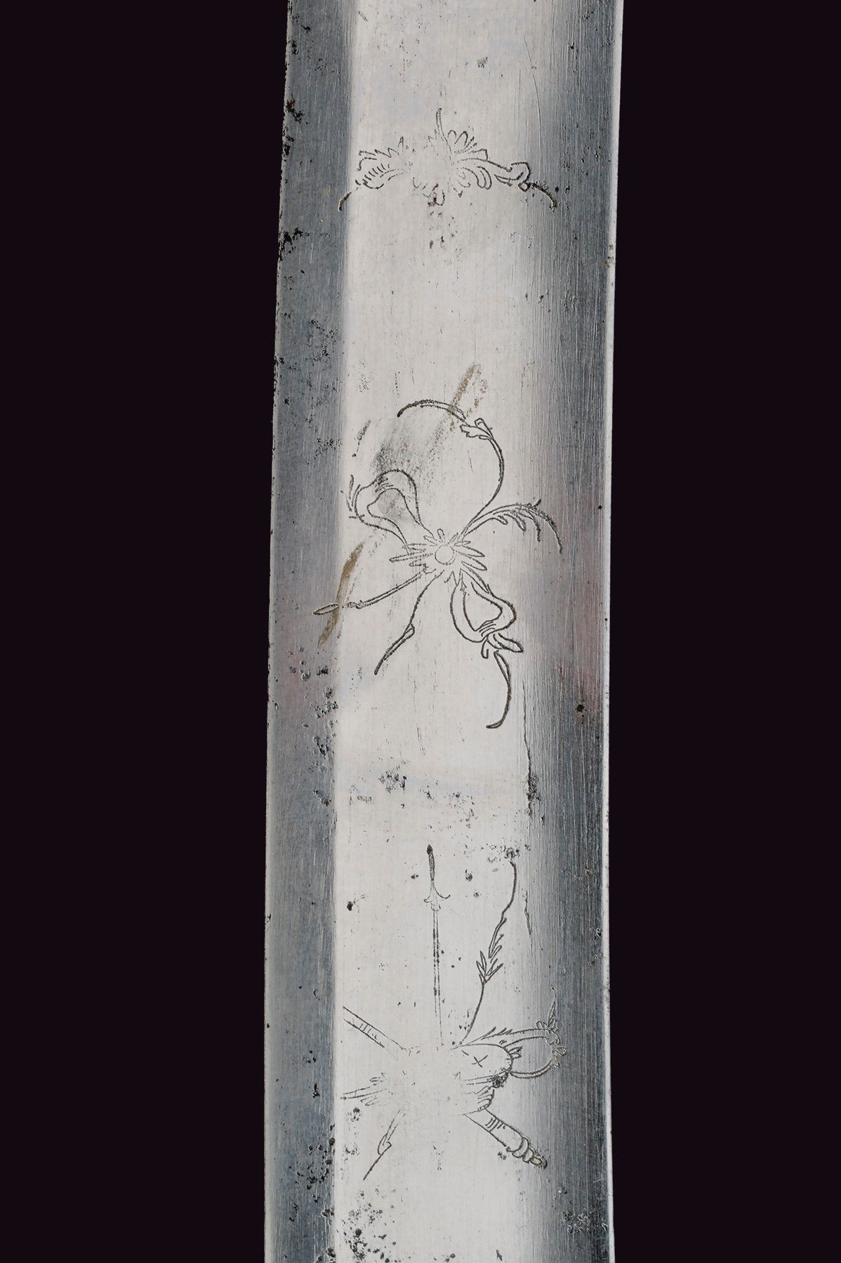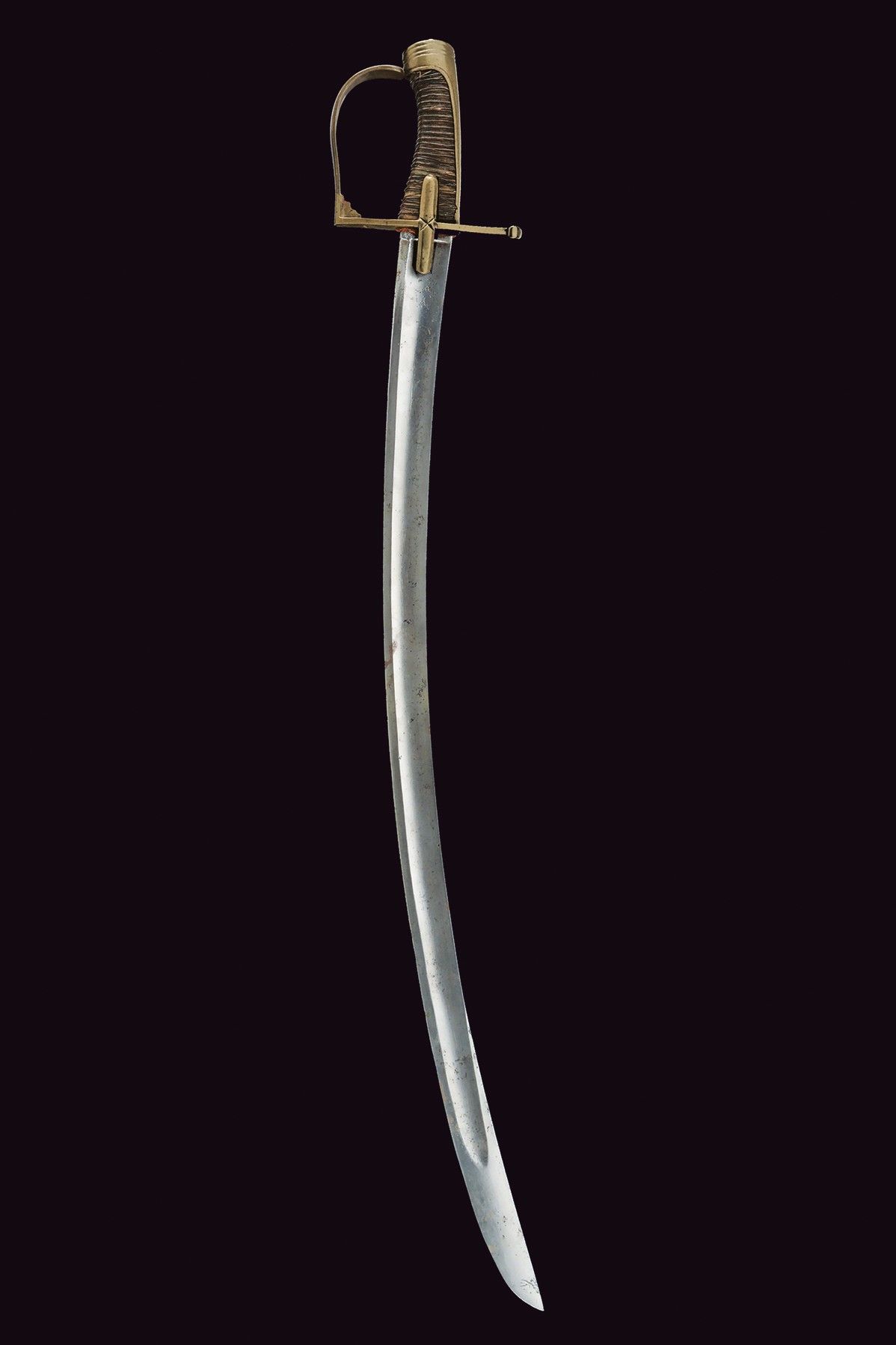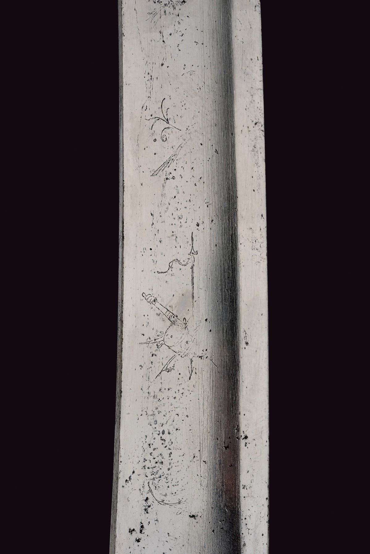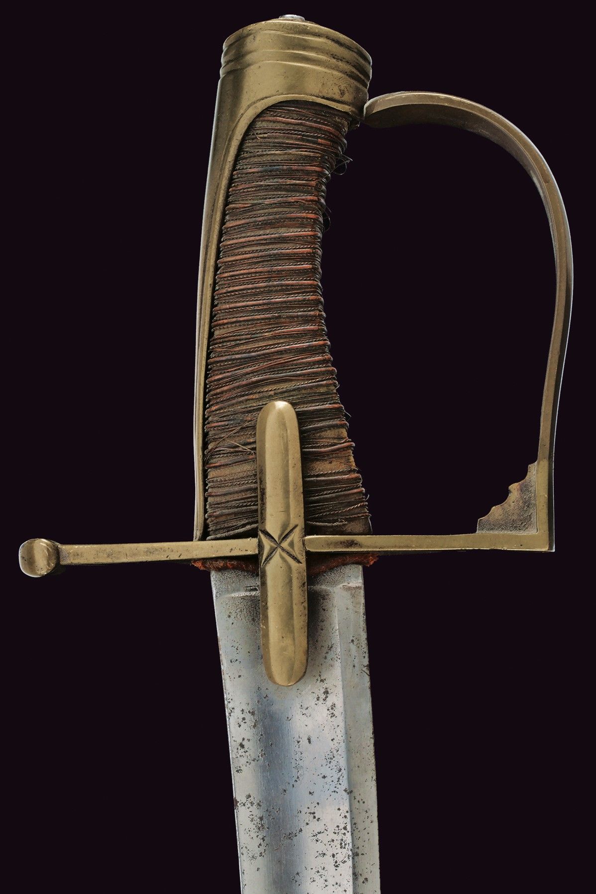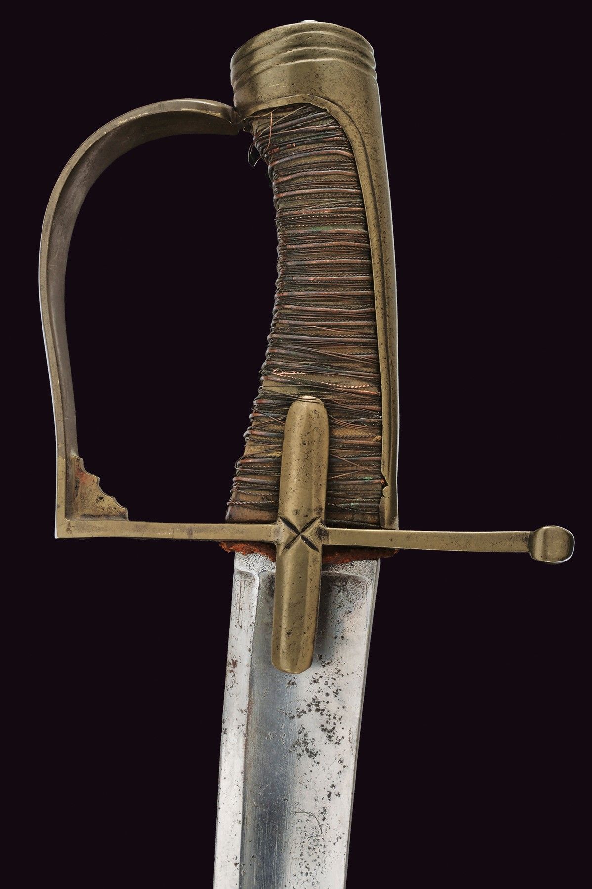 Francia, lunghezza 92 cm. Lama curva a un filo e breve controfilo, sgusciata per quasi tutta la lunghezza, con breve tallone. Intaccature, segni d'uso e del tempo. Al dorso la firma Peter Willhelm Knecht Fabriquant in Solingen. Larghezza alla base 3,7 cm. Lunghezza circa 78 cm. Fornimento in ottone. Guardia a staffa (riparazione probabilmente realizzata in epoca d'uso) palmata verso l'alto. Alette fermafodero con incisione a X al centro, braccio di parata dritto. Cappetta lunga delineata. Impugnatura in legno con resti di trecciole in rame. Priva di fodero.