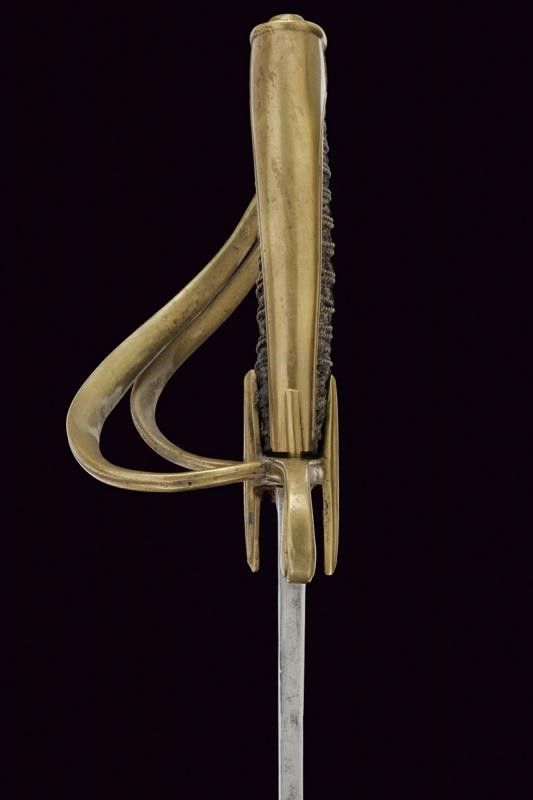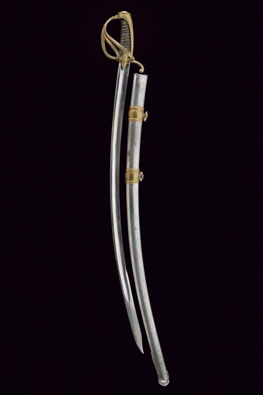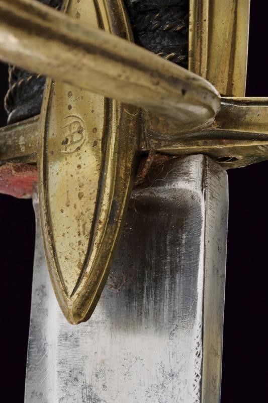 Francia, lunghezza 97 cm. primo quarto del XIX Sec. Lama curva a un filo e breve controfilo con jelman appena accennato e ampio sguscio. Fornimento in ottone. Alette fermafodero cuspidate, delineate, una con punzone a scudo entro cerchio, guardia a la chasseur a tre rami, cappetta lunga liscia. Impugnatura in legno con resti di rivestimento in pelle (di pesce?) e con trecciola metallica. Fodero in ferro (intaccature pulite) a due campanelle con fascette in ottone, imboccatura (mancanza all'orlo) e vela in ferro.