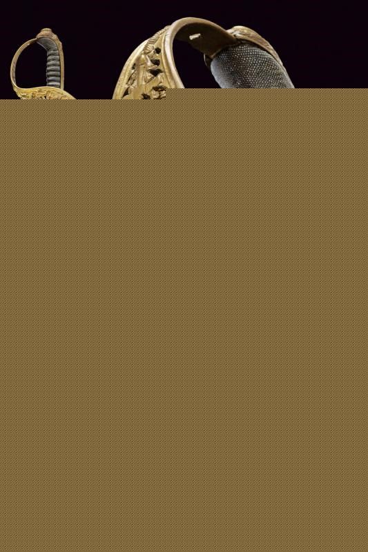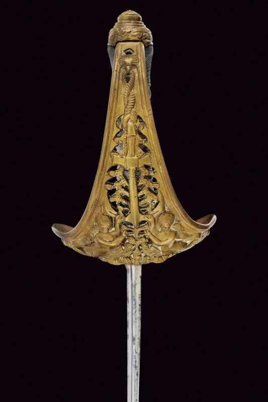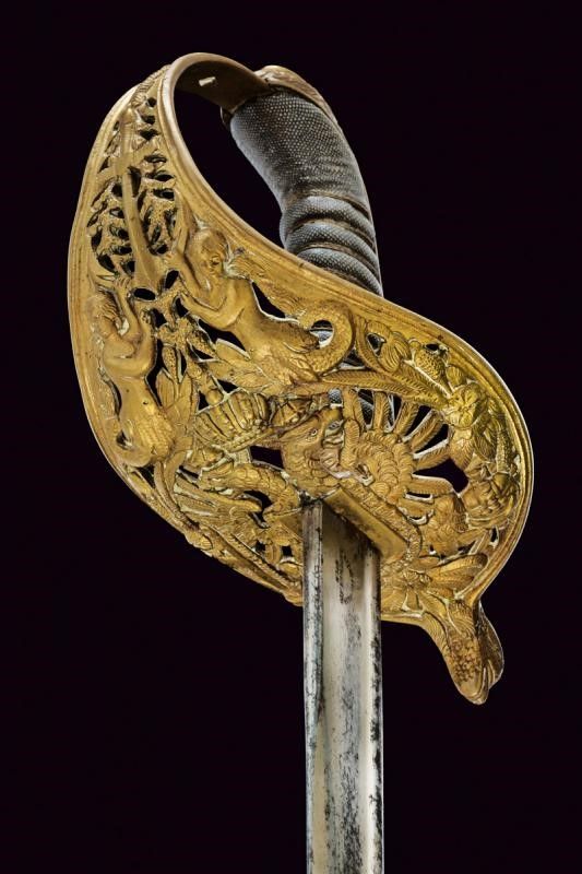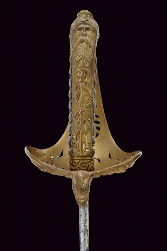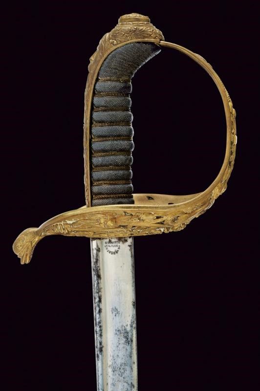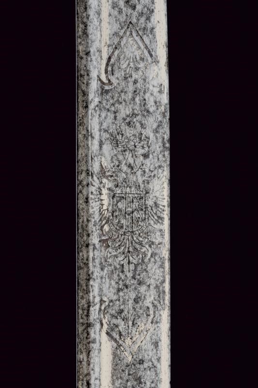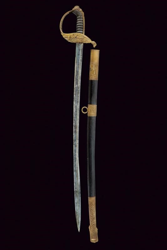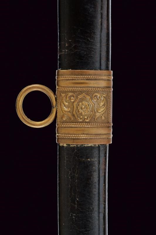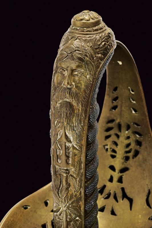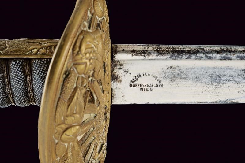 Austria, lunghezza 84 cm. Seconda metà del XIX Secolo Lama curva a un filo e breve controfilo, con dorso a bacchetta, incisa sul lato di terza con l'aquila bicipite imperiale austriaca sormontata da corona ed entro un cartiglio, sul lato di quarta con lo stesso cartiglio ma recante un'àncora coronata; alla base resti di marcature ALCIS... / WAFFENERZE...GER / WIEN e WEYERSBERG & STA...M / SOLINGEN. Fornimento in ottone con resti di doratura. Ampia guardia lavorata in rilievo e a traforo con un'ancora sorretta da due sirene. Attorno alla lama riprodotta l'aquila imperiale austriaca. Il breve braccio di parata a delfino. Cappetta lunga con testa di Tritone, tridente e fronde di lauro. Impugnatura con rivestimento in pelle di pesce e trecciola metallica. Fodero in cuoio con fornimenti in ottone a una campanella fissa e un passante. Sulla cappa àncora in rilievo, il puntale con bel fregio a fiorami.