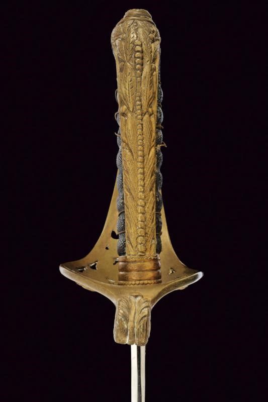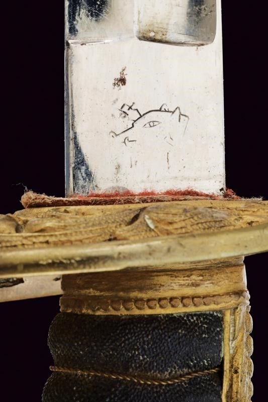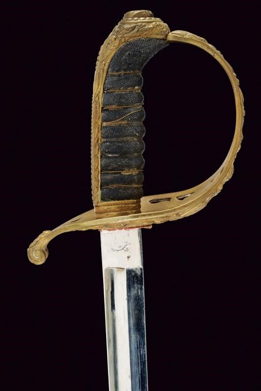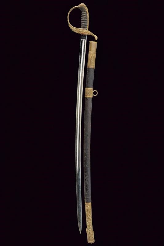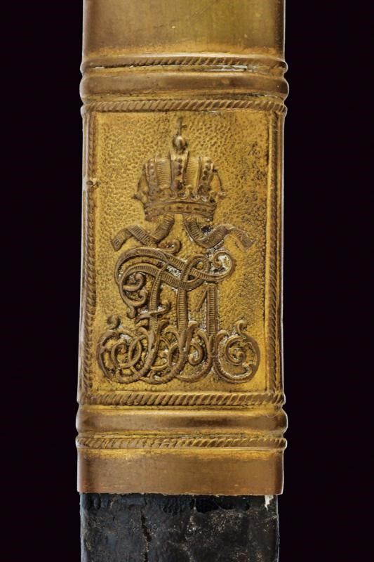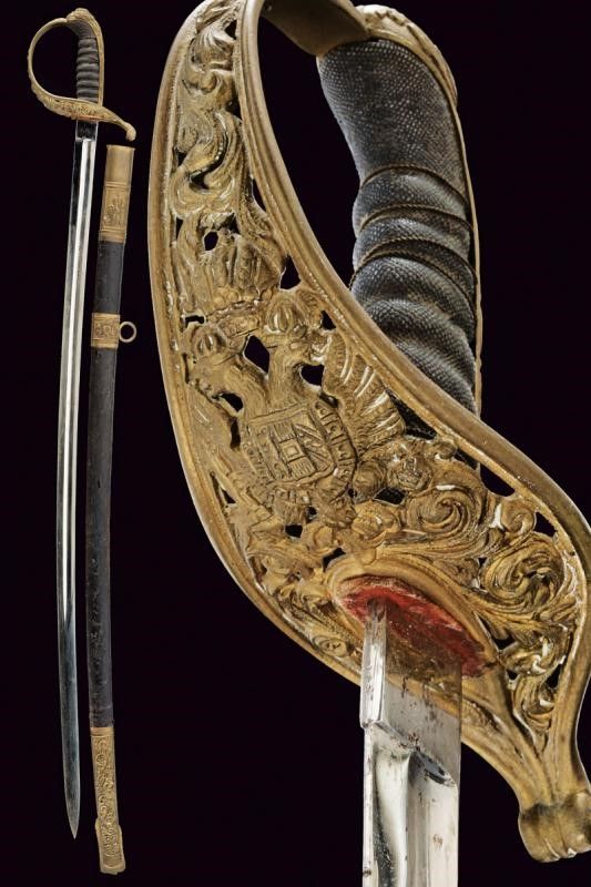 Austria, lunghezza 96 cm. 1900 circa Lama curva sgusciata per due terzi, a un filo, punta e breve controfilo, con tallone munito di resti di marca a cinghiale. Finitura nichelata ben conservata. Fornimento in ottone con resti di doratura. Ampia guardia decorata in rilievo e a traforo con l'aquila bicipite imperiale austriaca attorniata da fiorami. Cappetta lunga con fronde di lauro in rilievo. Impugnatura con rivestimento in pelle di pesce e resti di trecciola metallica. Fodero in ferro con rivestimento di cuoio (danni, segni d'uso e del tempo); fornimenti in ottone a una campanella fissa e un passante. La cappa con il monogramma coronato dell'imperatore FJ1.
