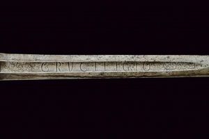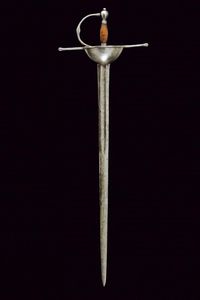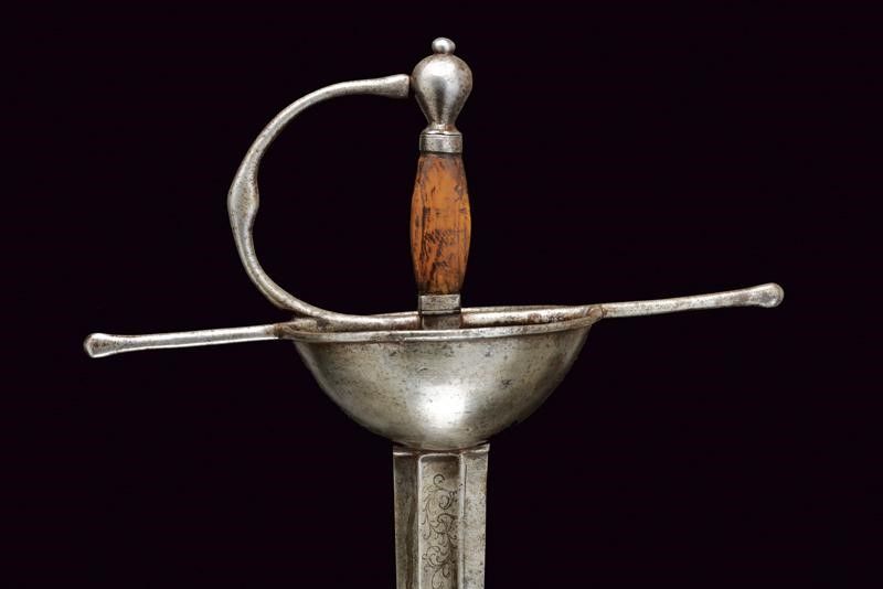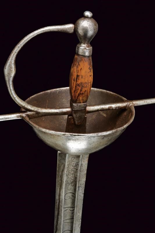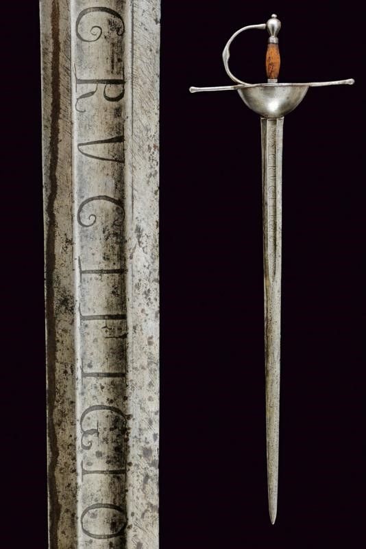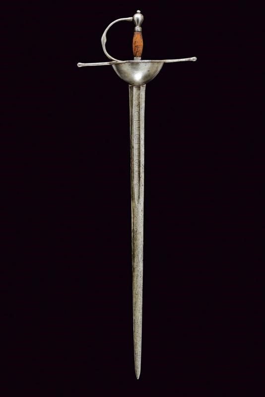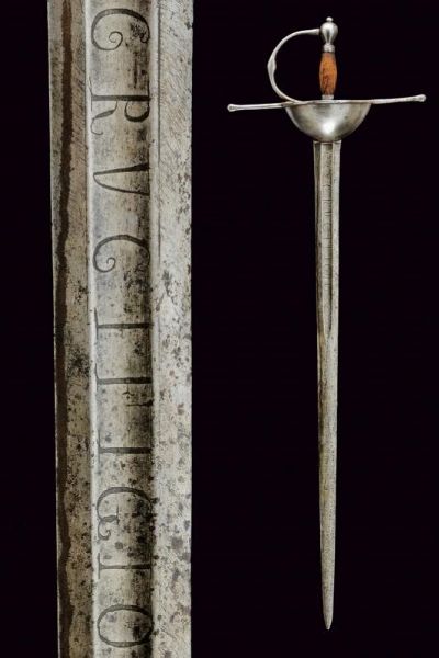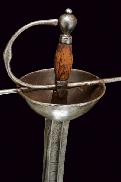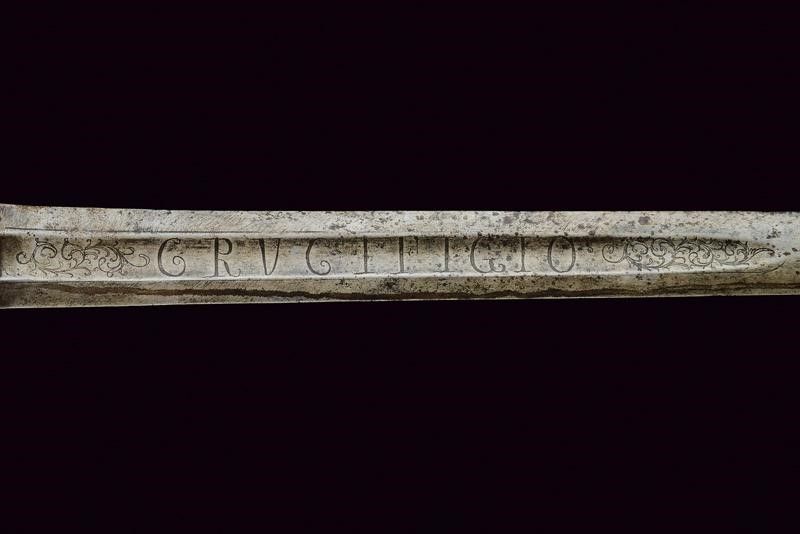 Spagna, lunghezza 97.5 cm. XVIII Secolo Lama di media larghezza a due fili con sguscio nella prima parte recante l'iscrizione CRUCIFIGIO tra disegni floreali. Coccia emisferica, liscia e con bordo rilevato. Bracci dell'elso e ramo di guardia con estremità ingrossate. Piccolo pomo a vaso. Impugnatura in legno senza trecciola, con ghiere in ferro.