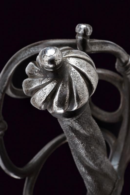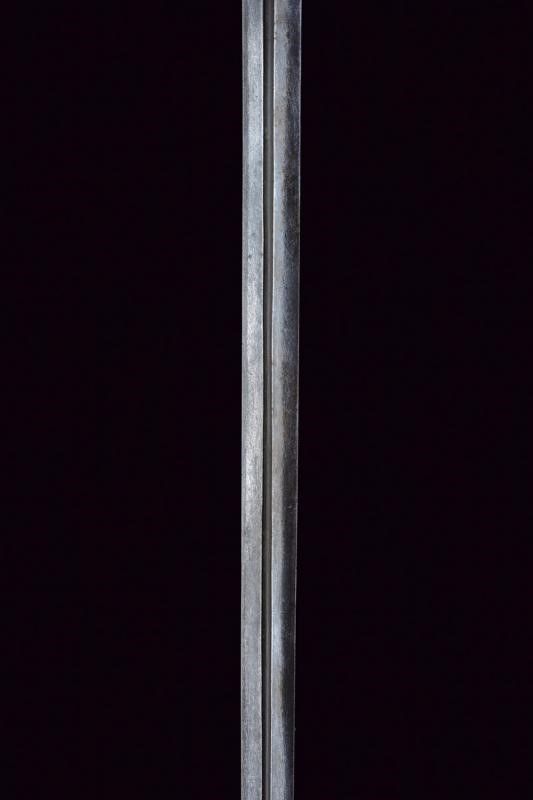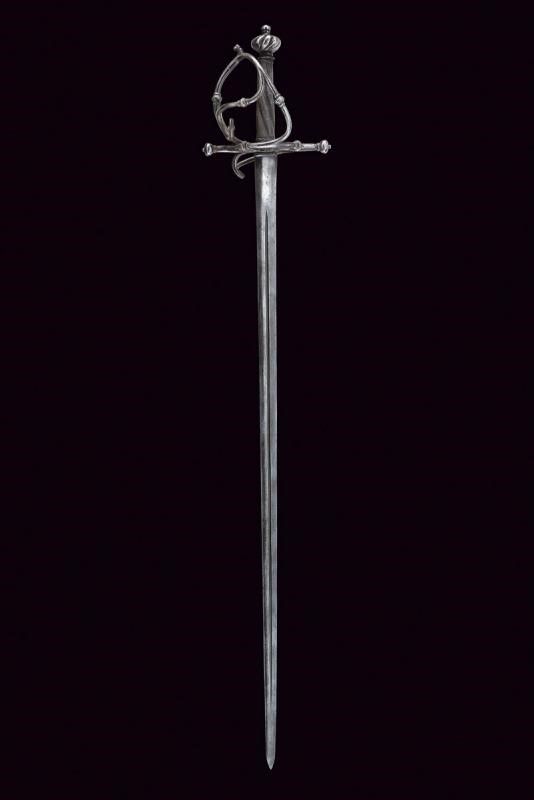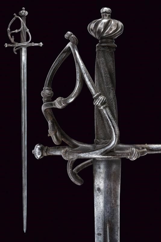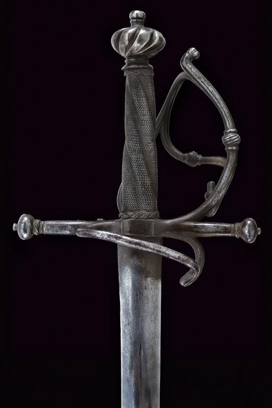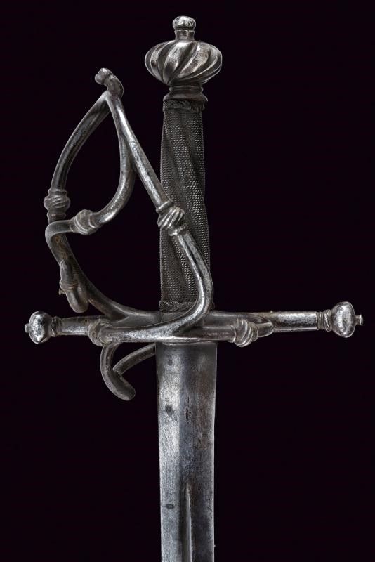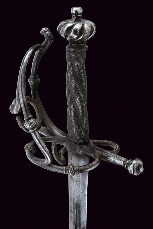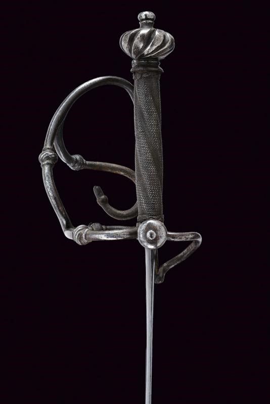 Germania del Sud, lunghezza 96 cm. 1680 circa Lama dritta a due fili di sezione lenticolare con scanalatura in mezzeria. Fornimento in ferro con piccolo ponticello, bracci dell'elso dritti di sezione tonda con estremità a bottoni. Due rami di guardia uniti da un ramo curvo e muniti di nodi intagliati a fingere il tortiglione. Pomo a turbante con profonde scanalature. Impugnatura in legno a spire rivestita con trecciola e dotata di teste di moro in filo di ferro.