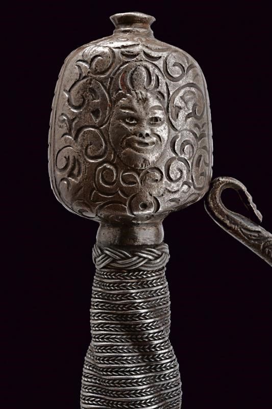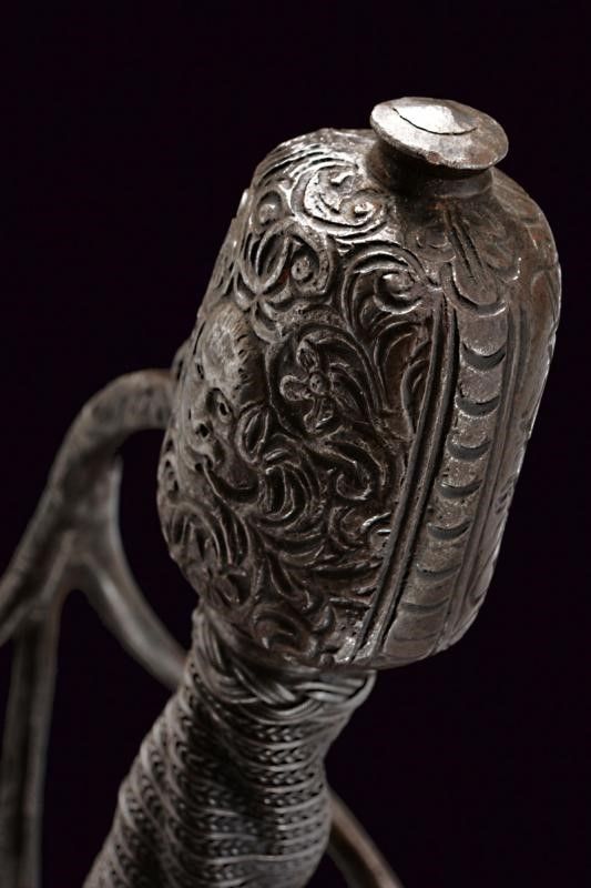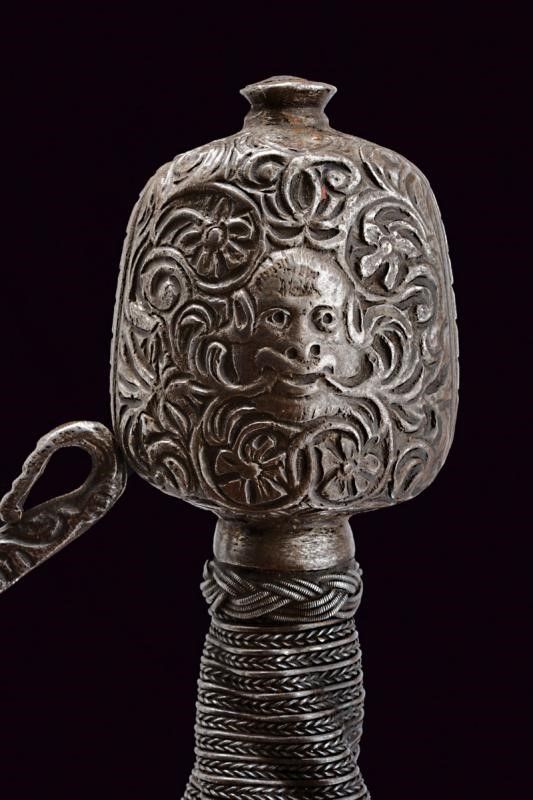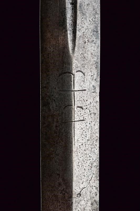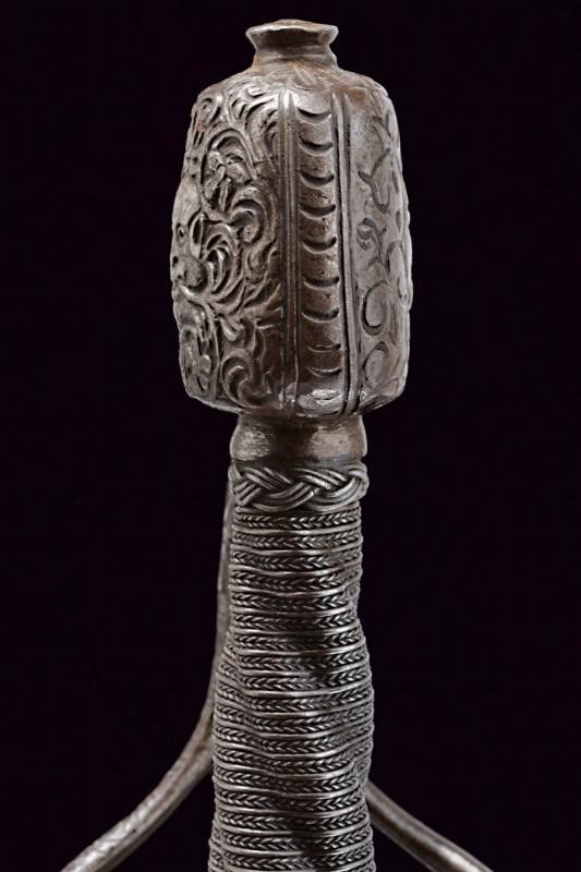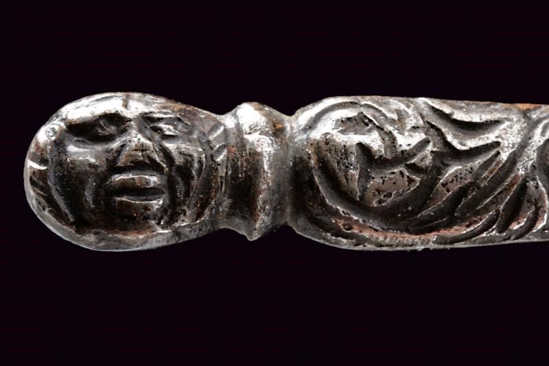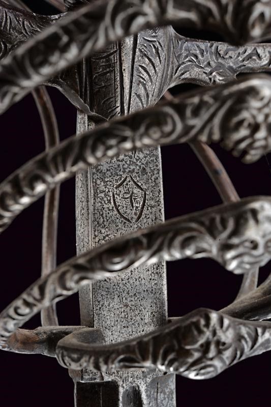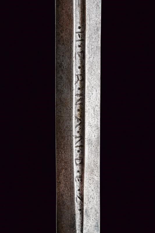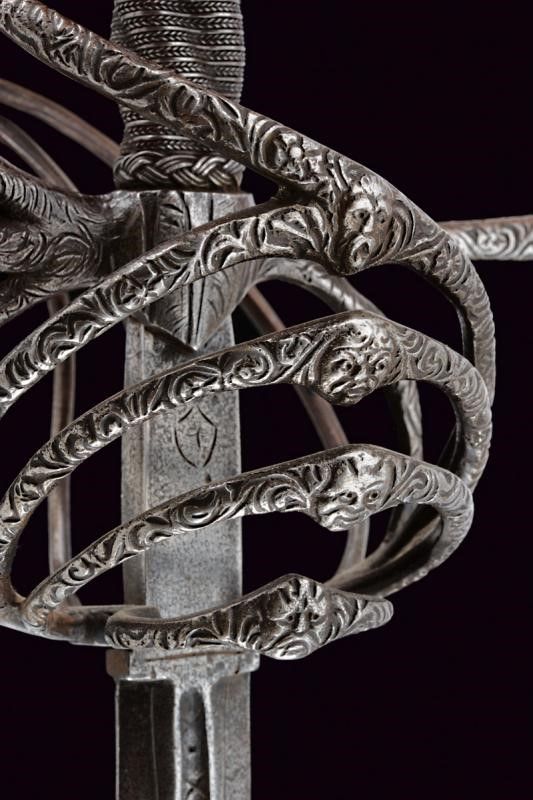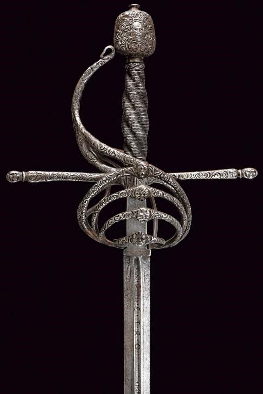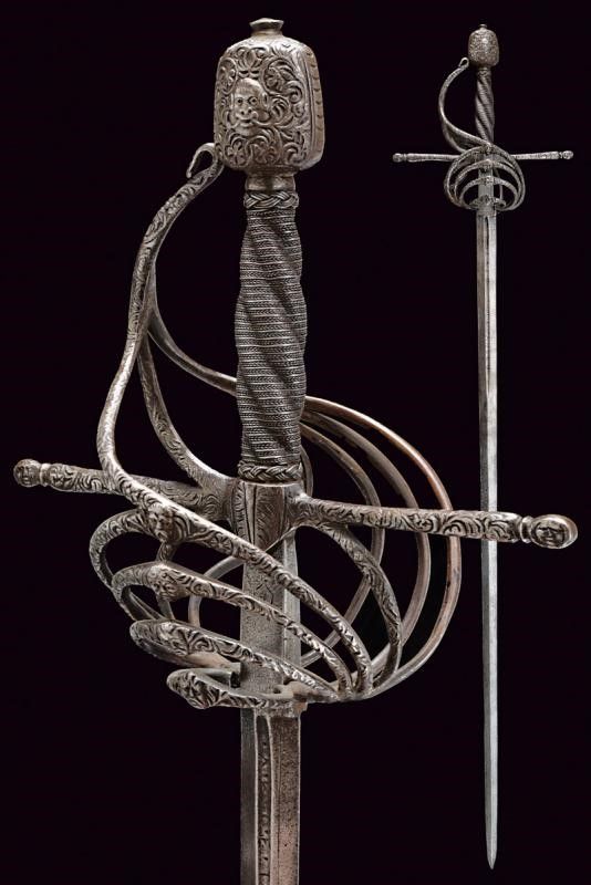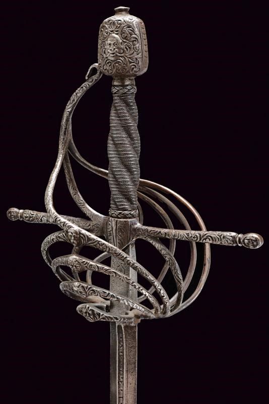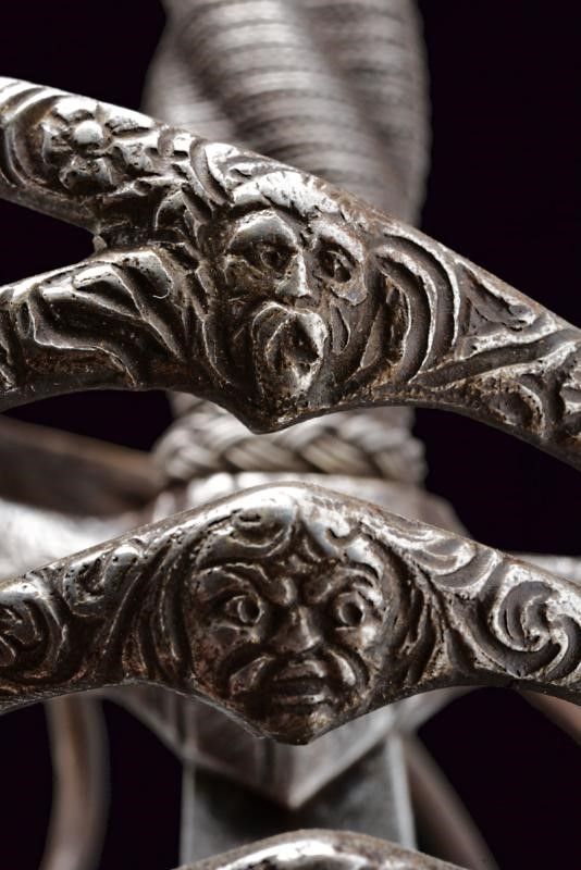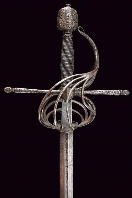 Italia, lunghezza 125 cm. 1600 circa Lunga lama dritta a due fili, scanalata nella prima parte e recante la firma PIETRO HERNANDEZ fra piccole incisioni geometriche, poi a sezione di losanga, dotata di ricasso inciso con scudetto. Bellissimo fornimento in ferro recante mascheroni intagliati al centro dei ponti, alle estremità dei bracci dell'elso e al centro del pomo e circondati disegni floreali; quattro rami di controguardia, lisci e di sezione tonda. Impugnatura in legno rivestita da trecciola in filo di ferro a spire e con teste di moro alle estremità.