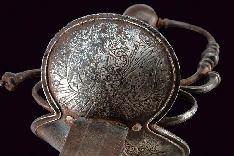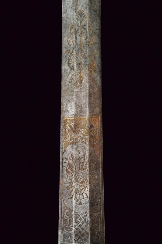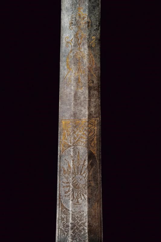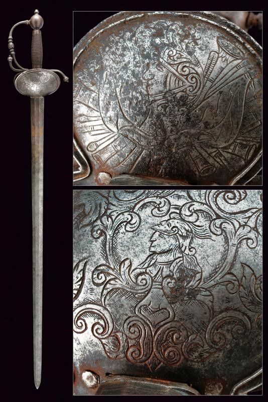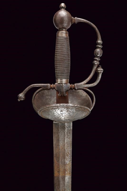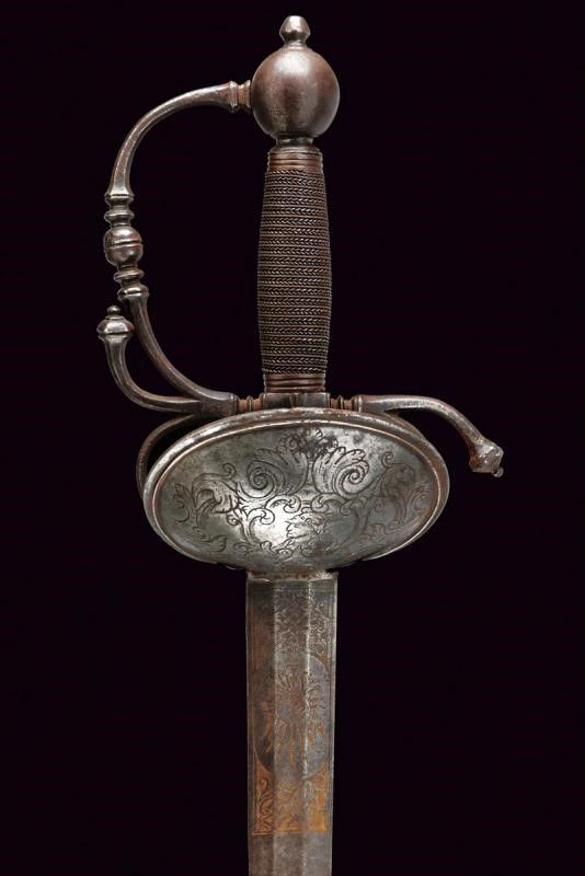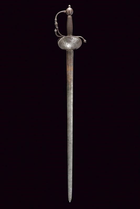 Francia, lunghezza 97 cm. Fine XVII - Inizio XVIII Sec. Lama dritta di media larghezza a due fili di sezione esagonale con sottile tallone, la prima parte finemente incisa a trofei tra bande intrecciate e motivi floreali con resti di doratura. Il ricasso con punzone, fornimento in ferro con doppia valva, quella sul lato anteriore di dimensioni maggiori e come quella posteriore con bordo leggermente nervato e incisa con un busto fra motivi floreali e un altro busto su un trofeo d'armi, zone con danni da ruggine. L'elso a S e il ramo di guardia con intagli al centro e alle estremità, massello intagliato, archetti lisci. Pomo quasi sferico con bottone. Impugnatura in legno rivestita da trecciola metallica e con ghiere scanalate.