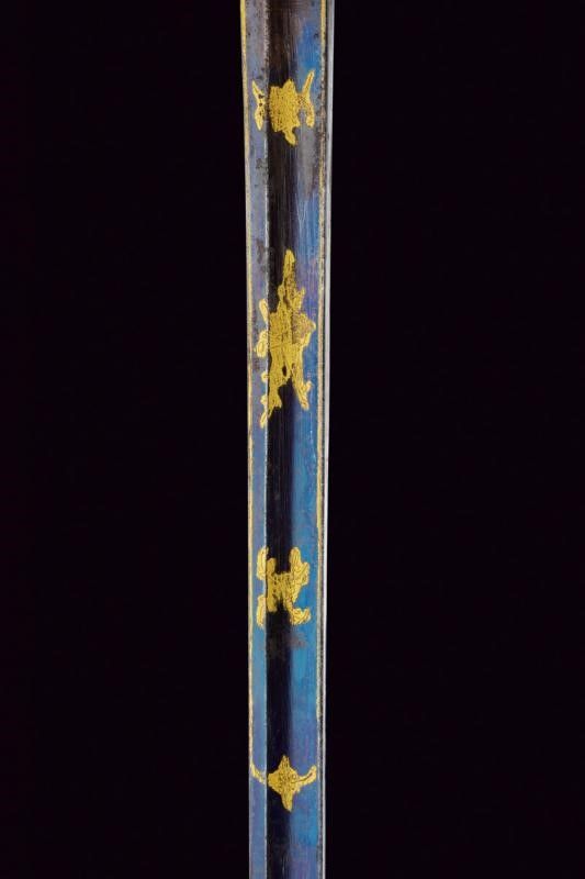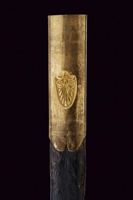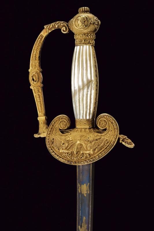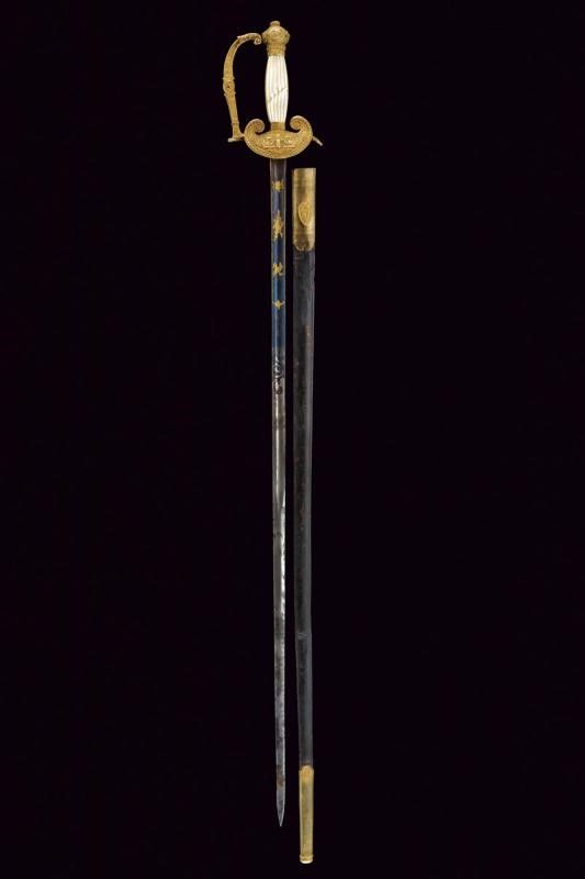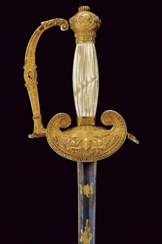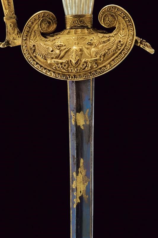Francia, lunghezza 92 cm. 1810 - 1815 circa Lama dritta a un filo e controfilo con sguscio centrale, incisa e dorata su fondo blu a trofei e a motivi floreali al forte. Fornimento in ottone dorato; la pelta recante volto cinto d'elmo tra due grifoni. Braccio di parata e ramo di guardia decorati a motivi floreali e geometrici. Il pomo recante testa con elmo all'antica e decori floreali. Guancette in madreperla. Fodero in cuoio (difetti) con fornimenti in ottone.