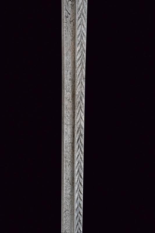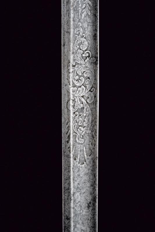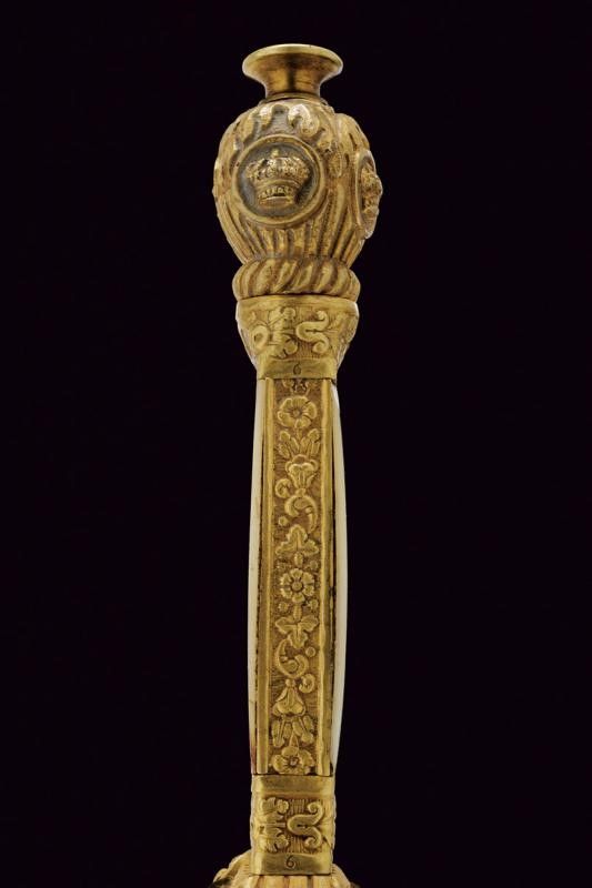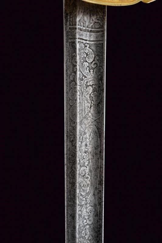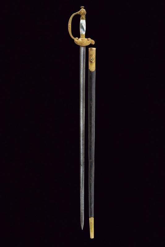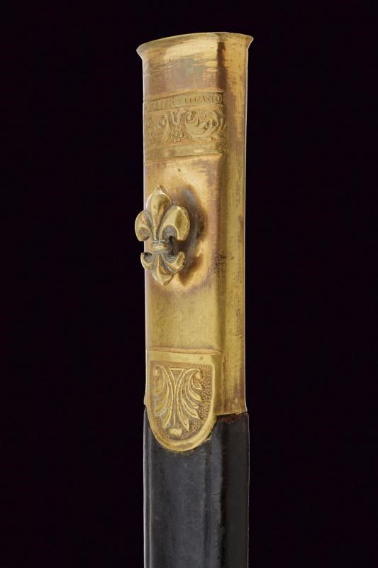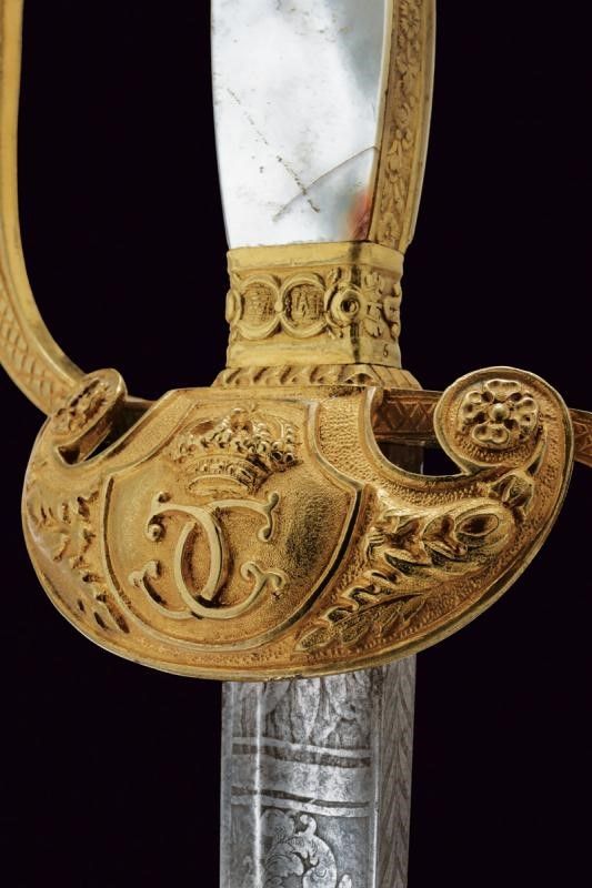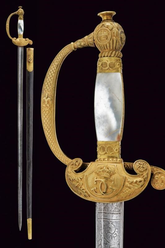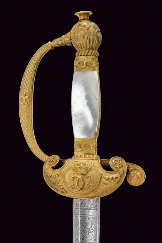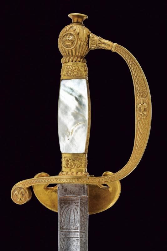 Ducato di Parma e Piacenza, lunghezza 99 cm. Prima metà del XIX Secolo Bella lama dritta a un filo e breve controfilo, finemente incisa a trofei e a motivi floreali al forte, anche il dorso in parte inciso; breve tallone. Fornimento in ottone dorato; la pelta con monogramma a C speculari sormontate da corona, il braccio di parata e il ramo di guardia decorati a zigrinature e con giglio, rispettivamente all 'estremità e al centro. Pomo sferico ornato con corone in bassorilievo e dotato di bottone schiacciato al sommo. Guancette in madreperla (piccola mancanza). Completa di fodero in legno rivestito di cuoio e dotato di fornimenti in ottone con resti di doratura, il bottone con giglio.