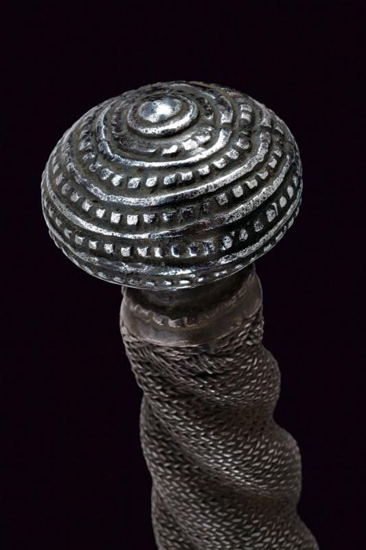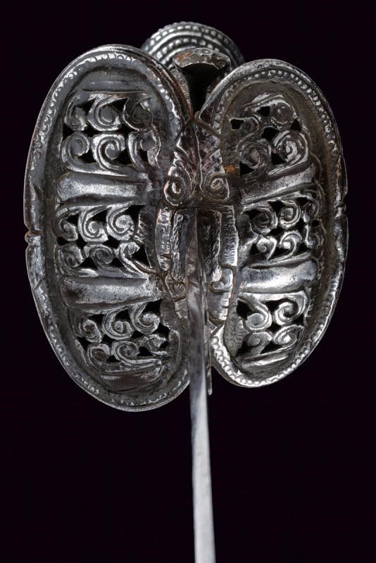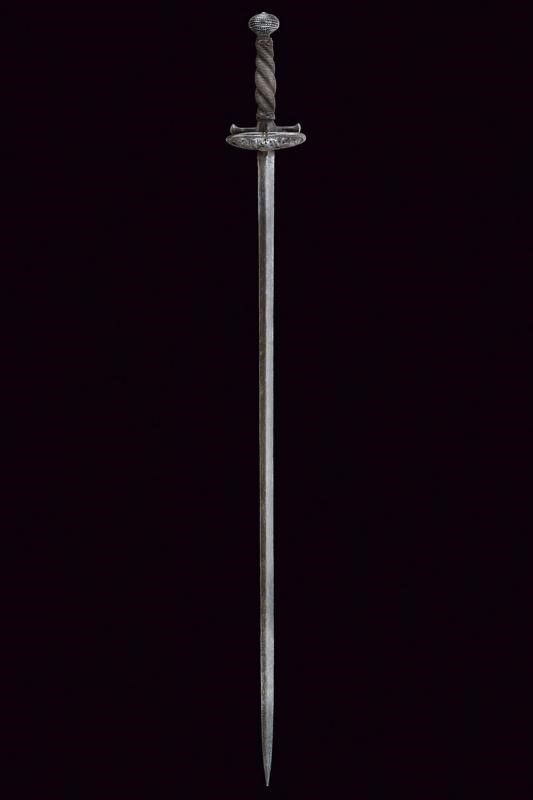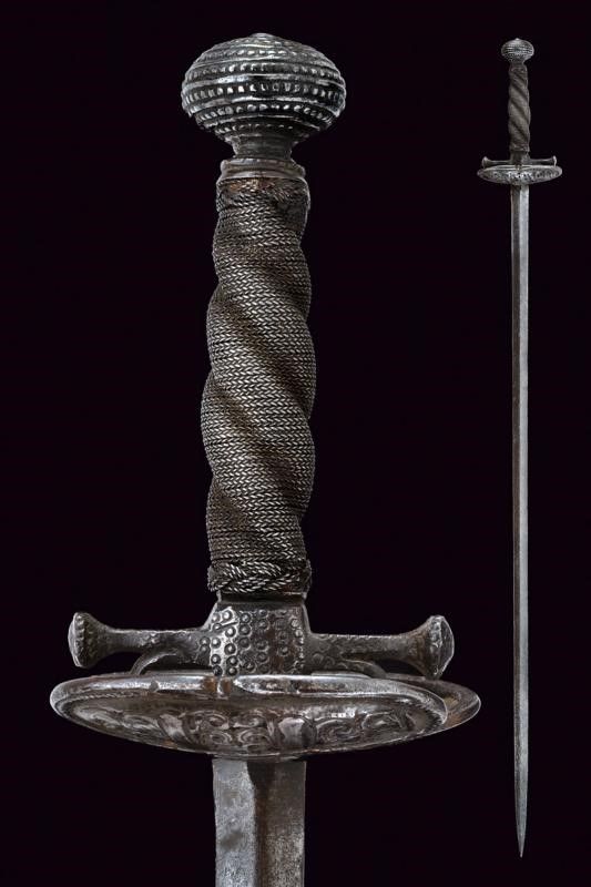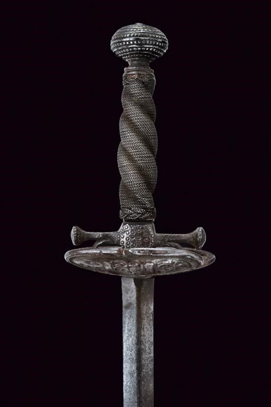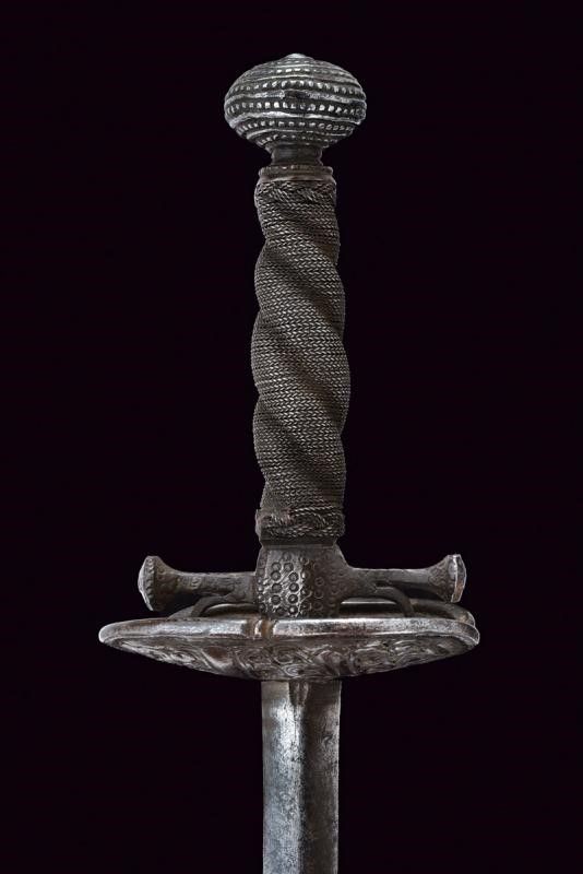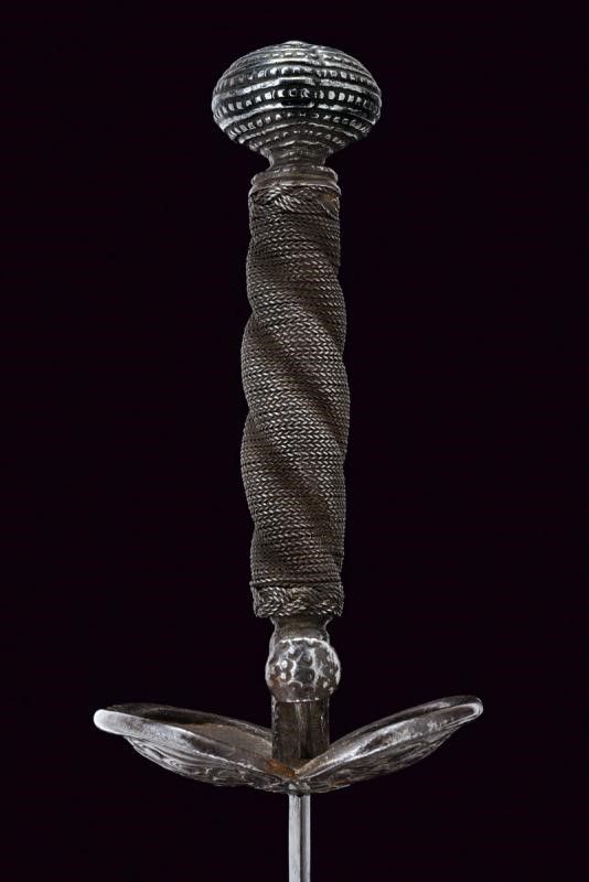 Germania, lunghezza 93 cm. 1680 circa Lama dritta a due fili, di sezione lenticolare. Fornimento in ferro intagliato, la doppia valva traforata ed incisa, corti bracci dell'elso di sezione quadra con estremità ingrossate ed decorate a piccoli cerchi come anche il massello. Due archetti. Pomo sferoide schiacciato, decorato a bande perlinate. Impugnatura in legno a spire con trecciola e teste di moro in filo di ferro.