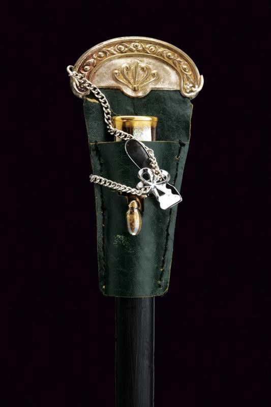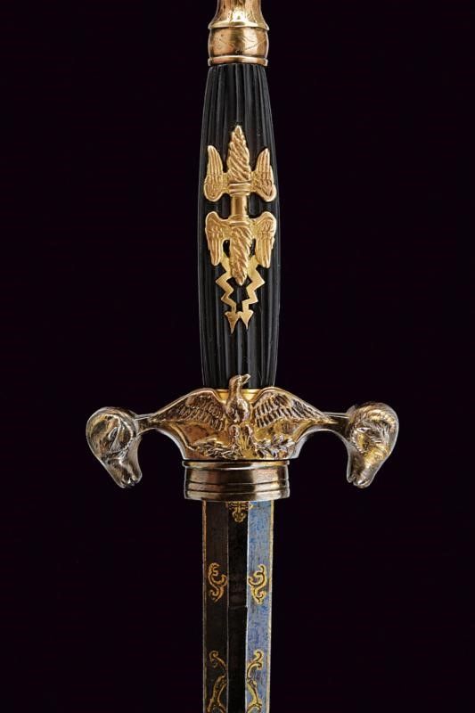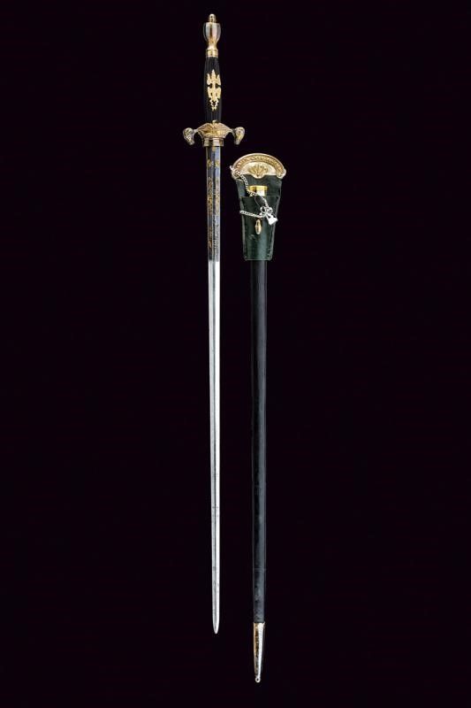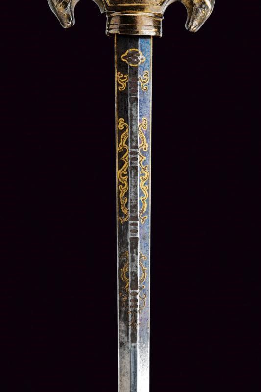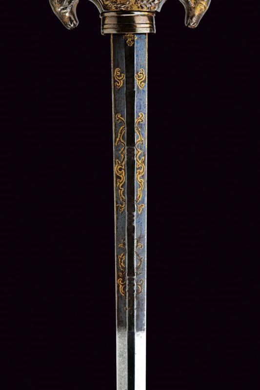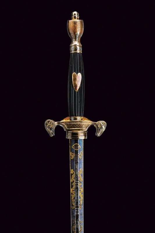 Francia, lunghezza 93,5 cm. Inizio del XIX Secolo Lama dritta di sezione esagonale, recante resti di brunitura color blu al forte e con piccole incisioni a racemi recanti tracce di doratura. Fornimento in argento con resti di doratura. Elso con bracci lavorati a testa di ariete, il massello con l'aquila imperiale in rilievo su saette e fronde di lauro nel lato anteriore, il retro con incisioni floreali. Impugnatura in ebano scanalato longitudinalmente con fornimento a droni e saette sul lato anteriore e cuore sul retro. Restauri. Pomo a vaso inciso a foglie. Fodero con fornimenti pertinenti e una taschetta di restauro.