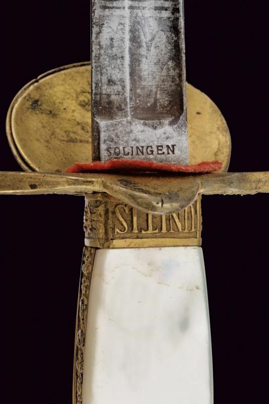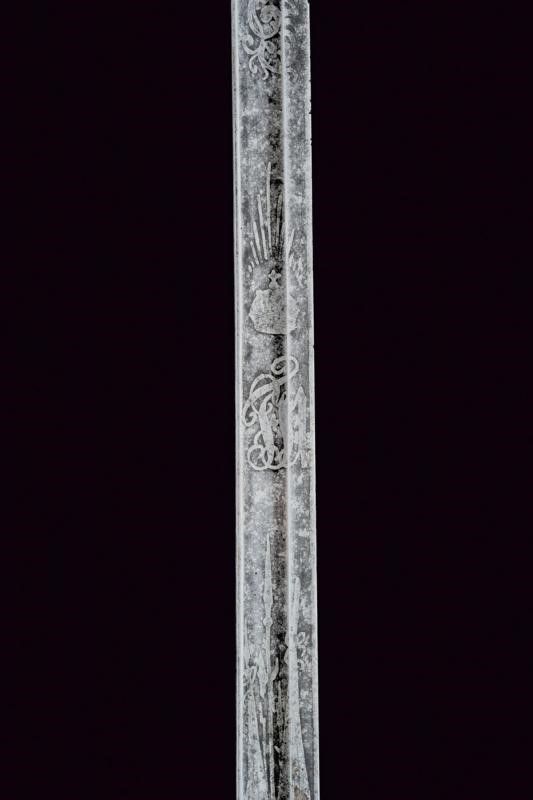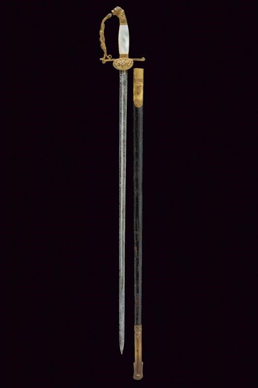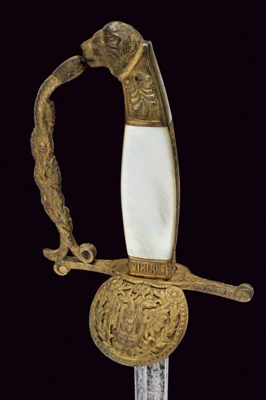 Austria, lunghezza 89,5 cm. Seconda metà del XIX Secolo Lama dritta sgusciata per tre quarti, recante al forte resti di incisioni a trofei, racemi e con il monogramma coronato FJ1. Fornimento in ottone con resti di doratura. Emblema imperiale austriaco entro serto di lauro montato su pelta, guardia con serpente avvoltolato a fronde di quercia. Pomo a testa di leone. Guancette in madreperla. Ghiera con il motto VIRIBUS UNITIS. Fodero in cuoio con segni d'uso e del tempo, fornimenti in ottone con decori in rilievo e resti di doratura, cappa con bottoncino.