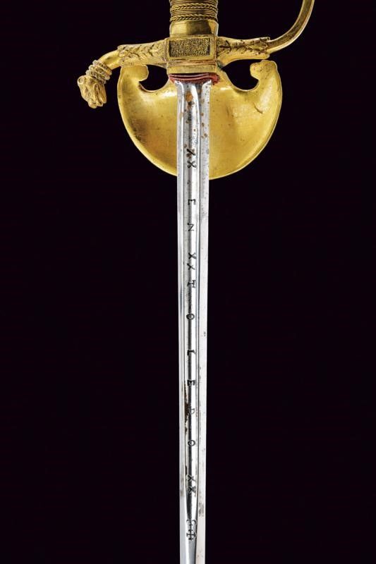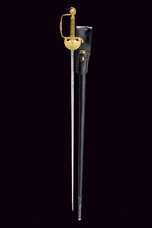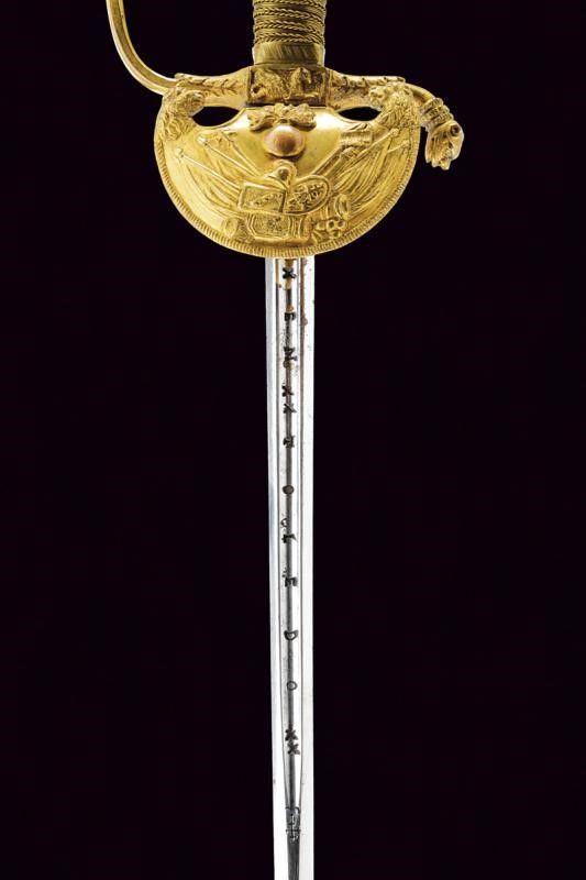Francia, lunghezza 95,6 cm. primo quarto del XIX Sec. Lama dritta settecentesca con profondo sguscio al forte recante l'iscrizione XX EN XX TOLEDO XX e una croce. Fornimento in ottone con resti di doratura a mercurio. Pelta con trofeo di scudi e bandiere sormontato da una granata fiammeggiante, alle due estremità teste di leone. Elso con massello recante grifone in rilievo, il braccio di parata culminante a testa di mostro. Il nodo della guardia e la base dei bracci lavorati a foglie d'acanto in rilievo. Pomo a elmo piumato. Una ghiera dell'impugnatura a stelle entro ruote dentate, l'altra liscia; il riveestimento in trecciole d'ottone. Fodero (non pertinente) in ferro con rivestimento in pelle e taschetta in cuoio.