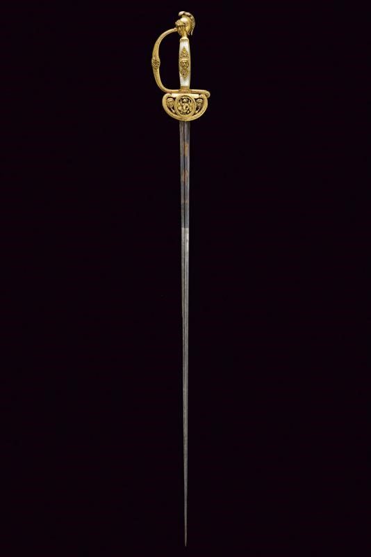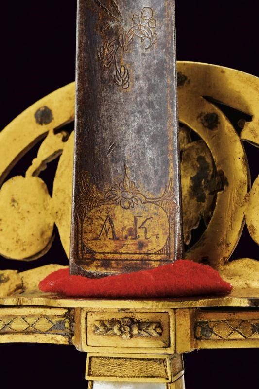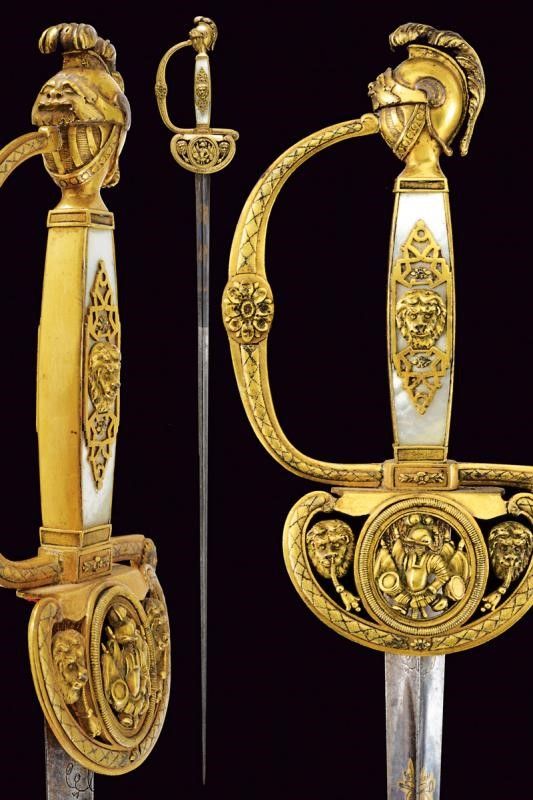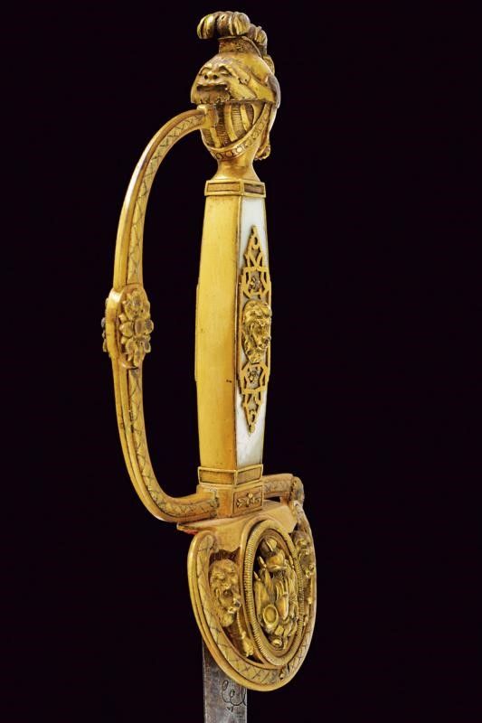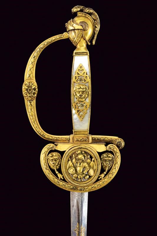 Francia, lunghezza 98.5 cm. 1800 circa Lama di sezione triangolare, incisa e dorata al forte su fondo blu a trofei e motivi floreali, marcata AK; fornimento in bronzo dorato, bella valva traforata a trofei e teste di leone, guardia decorata a fiori, pomo a elmo piumato; impugnatura in legno rivestita di madreperla con fornimenti in ottone parzialmente traforato e con testa di leone al centro.