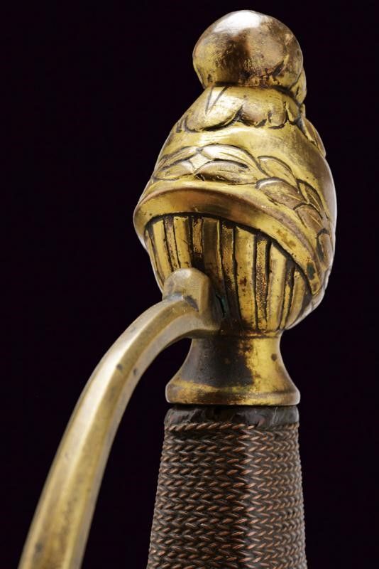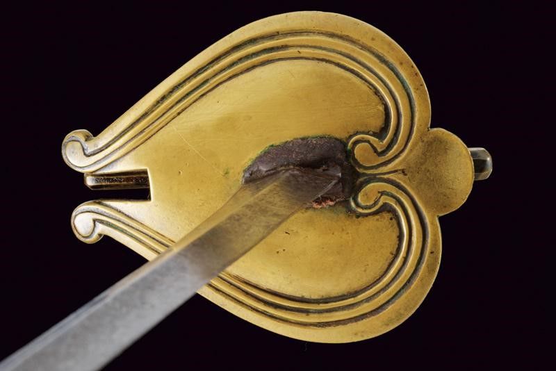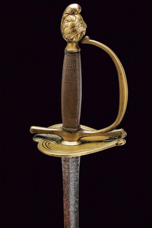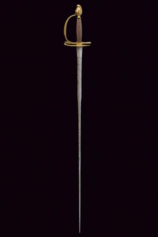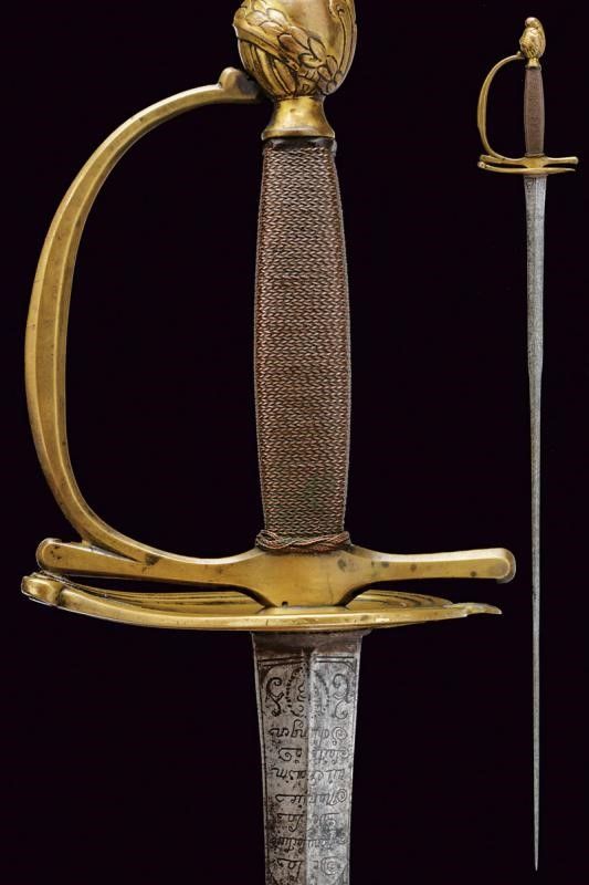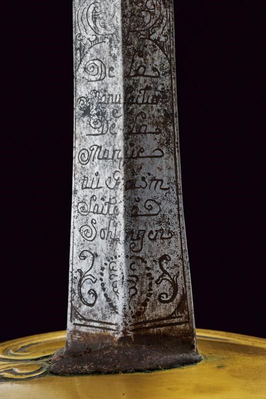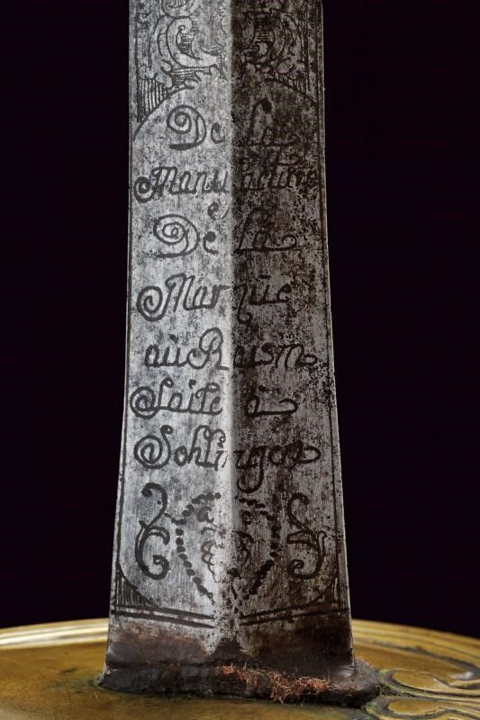 Francia, lunghezza 101.5 cm. Seconda metà del XVIII secolo Lama dritta a frantopino di sezione a losanga, ingrossata e incisa a motivi floreali nella prima parte, con base marcata De La Manufacture De La Marque au Raism Saite a Sohlingen su entrambi i lati. Fornimento in bronzo con coccia a cuore, pomo con elmo piumato, impugnatura in legno rivestita con trecciola e dotata di una sola testa di moro (l'altra, quella superiore, mancante) in fil di rame.