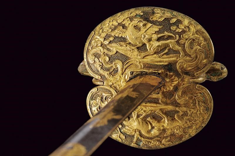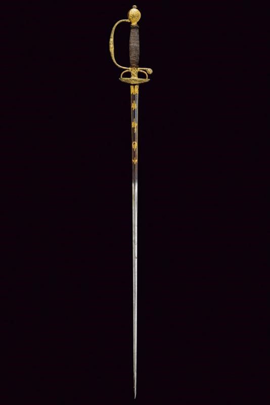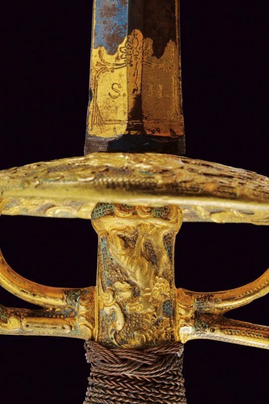Germania, lunghezza 98.5 cm. XVIII Secolo Lama dritta a due fili, costolata in mezzeria, di sezione esagonale al forte, con resti di finitura blu, piccole incisioni floreali e a trofei ageminate in oro; alla base la marcatura S.H. Fornimento in bronzo dorato; coccia a due valve con superficie esterna ornata in bassorilievo con un cane che lotta con un grifone, attorniati da volute e fiori su fondo granulato, la superficie interna con decorazione simile; segugi in rilievo anche al massello, la guardia con rocaille; impugnatura rivestita di trecciola in rame e con teste di moro. Pomo (la doratura parzialmente abrasa) sferoide con trofei e bottone.