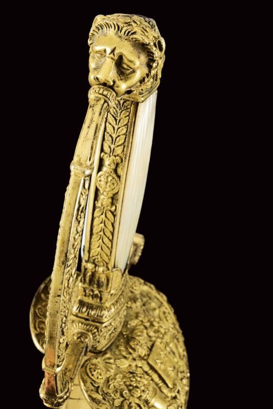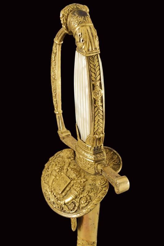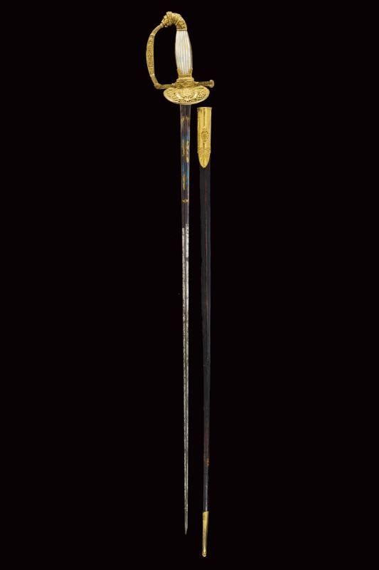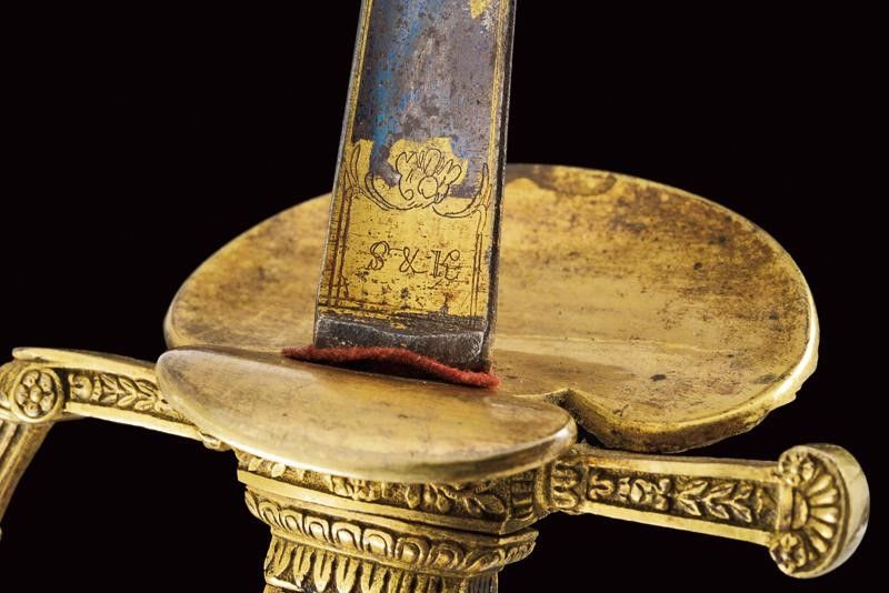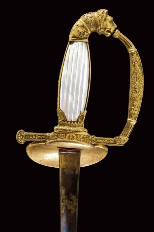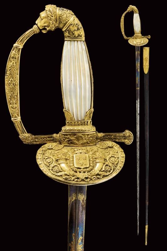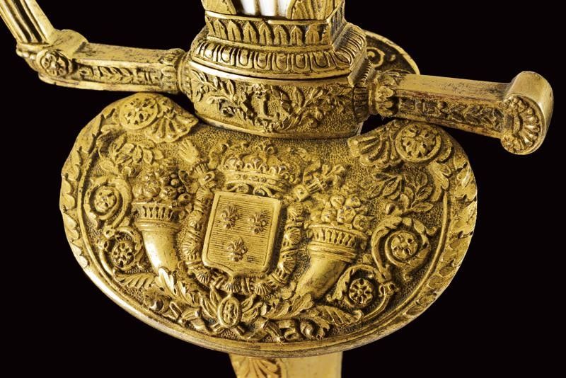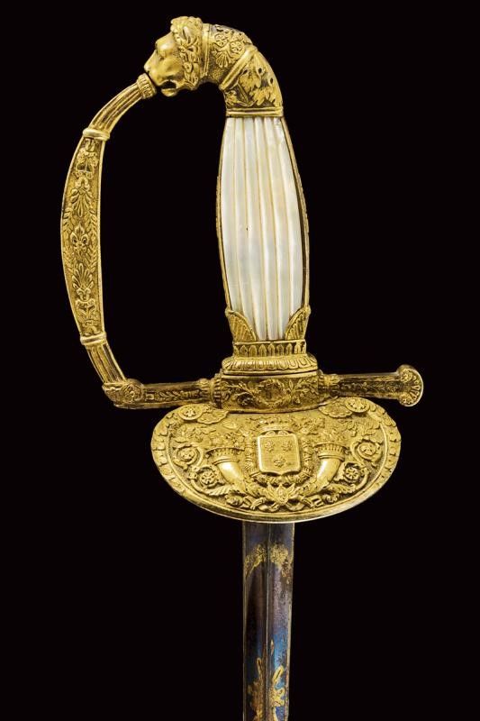 Francia, lunghezza 96.2 cm. primo quarto del XIX Sec. Lama dritta triangolare, incisa e dorata su fondo blu a trofei e motivi floreali nella prima parte, firmata al forte S&K. Bel fornimento in bronzo dorato lavorato in bassorilievo, pelta con scudo a tre gigli sormontato da corona e posto tra cornucopie e decorazioni floreali; il massello con monogramma L entro corona di lauro. Guardia, massello, braccio di parata e cornice dell'impugnatura decorati a motivi floreali; il ramo di guardia con giglio al centro. Pomo angolato a testa di leone, guancette in madreperla. Fodero in cuoio con fornimenti in ottone dorato, incisi en suite. Raro.