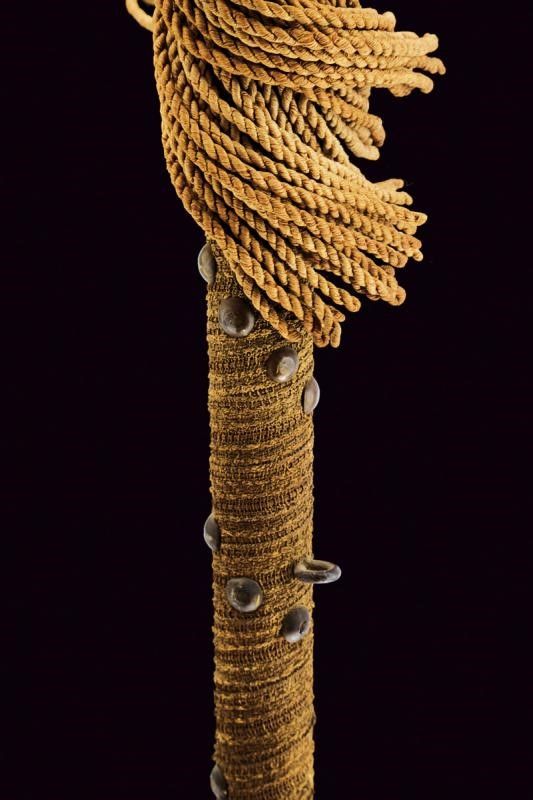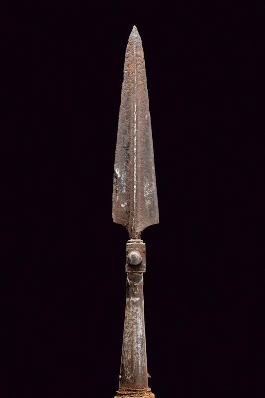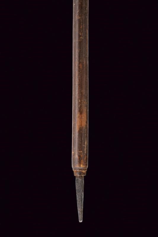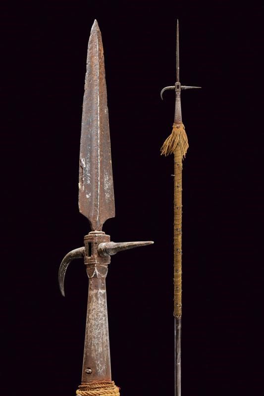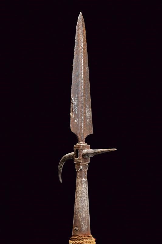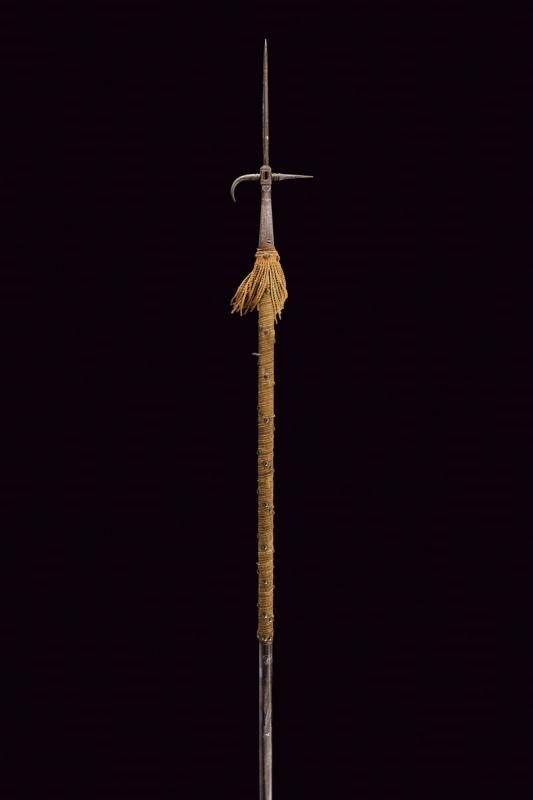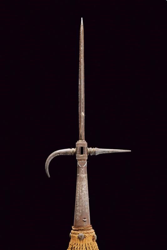 Europa, altezza 229 cm. XVII Secolo Ferro a lama a due fili (intaccature) con nervatura centrale che si prolunga nel collo; la lama è posta su un nodo a parallelepipedo traforato, questo munito di due arresti, uno a cuspide perpendicolare, l'altro a raffio. Gorbia troncoconica. Asta cilindrica probabilmente più tarda con nappa e chiodini.