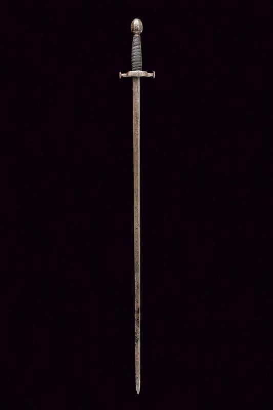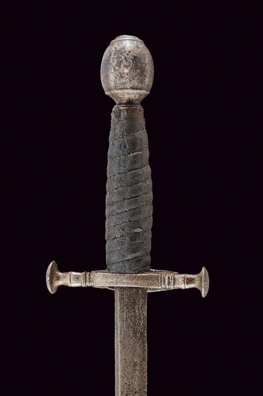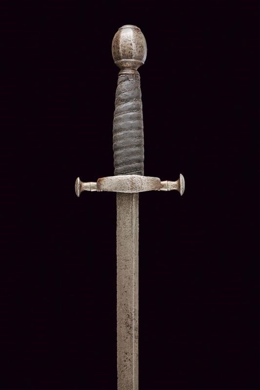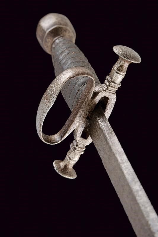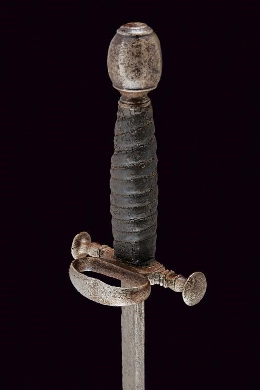 Inghilterra, lunghezza 94 cm. fine del XVII Sec. Interessante lama dritta a un filo e controfilo, crescente verso il dorso. Fornimento in ferro con bracci dell'elso dritti, intagliati a balaustro e con estremità a lavorate a grandi bottoni lenticolari. Pomo ovale, faccettato e con calotte leggermente rilevate. Impugnatura in legno, rivestita di cuoio e senza trecciola.