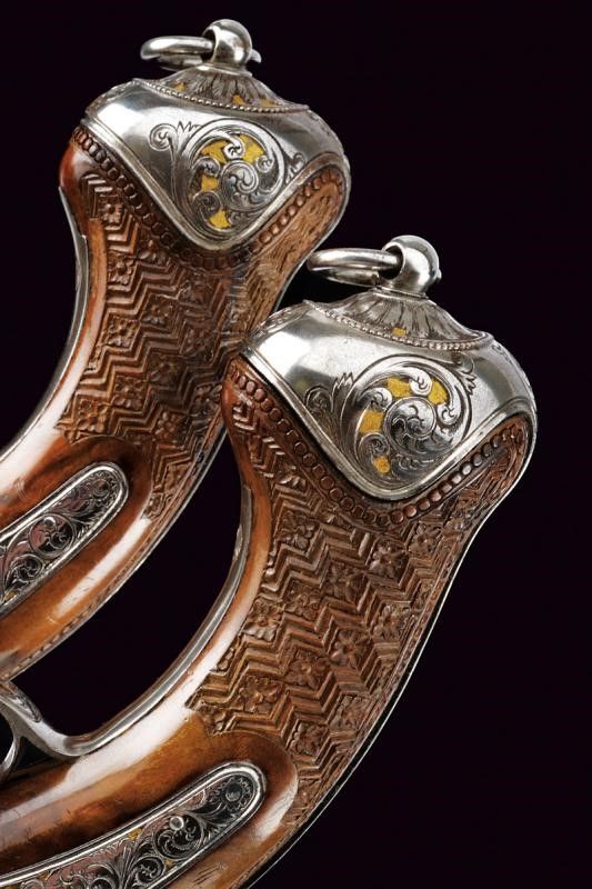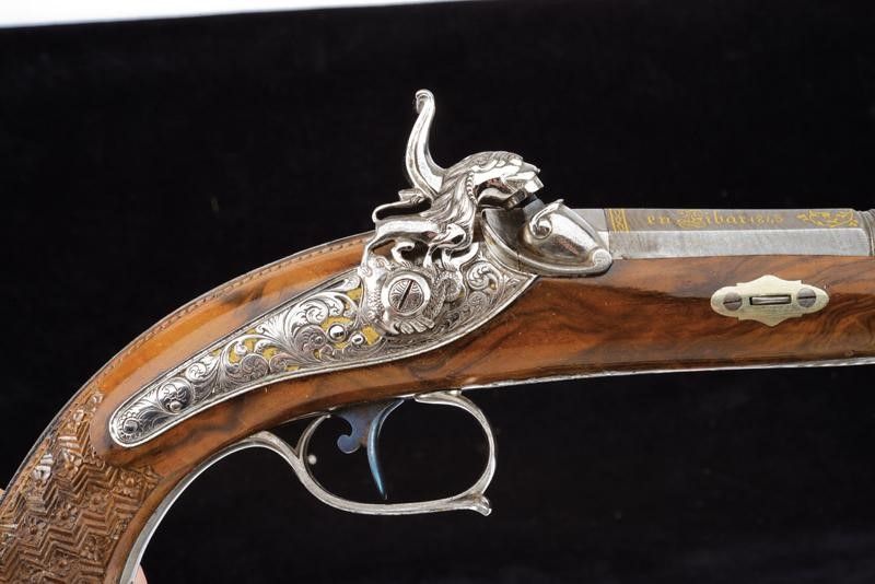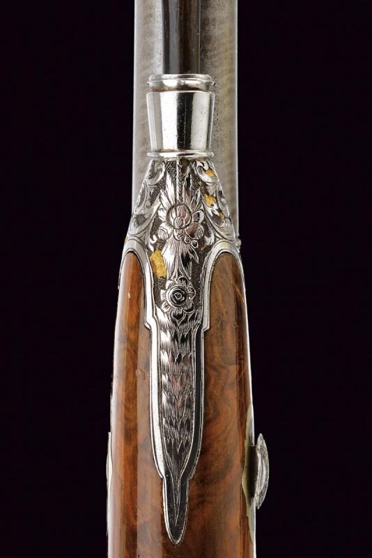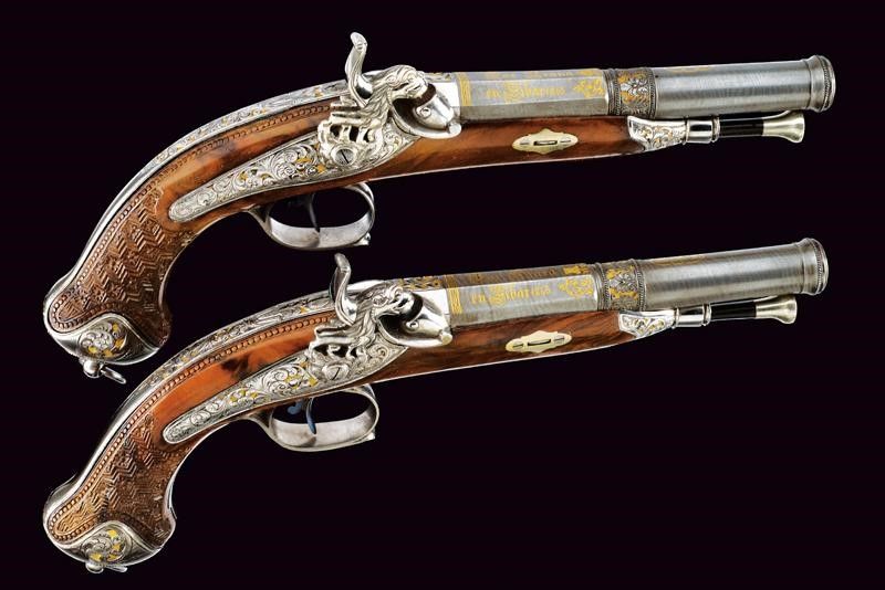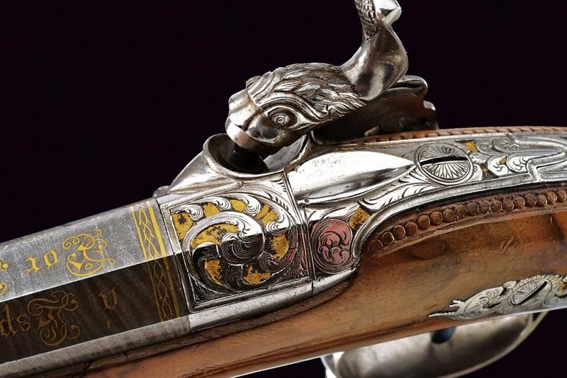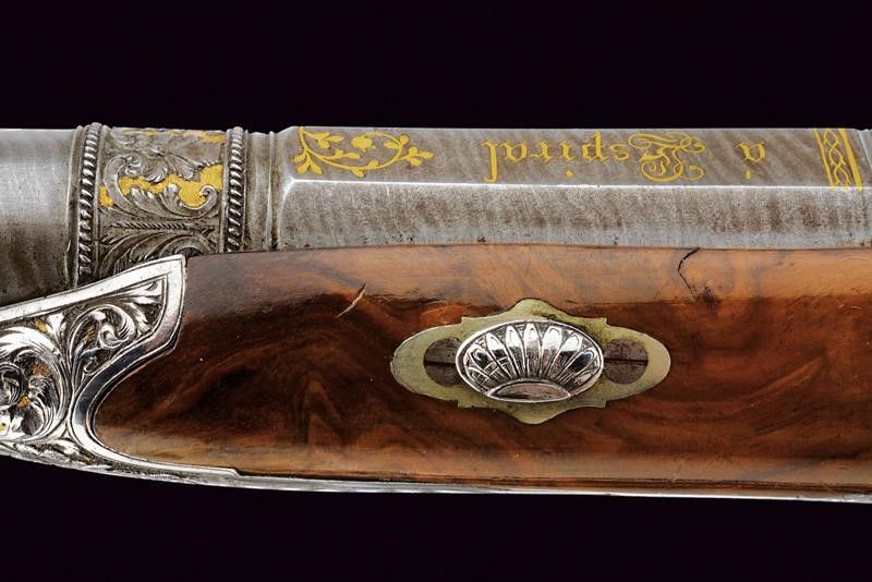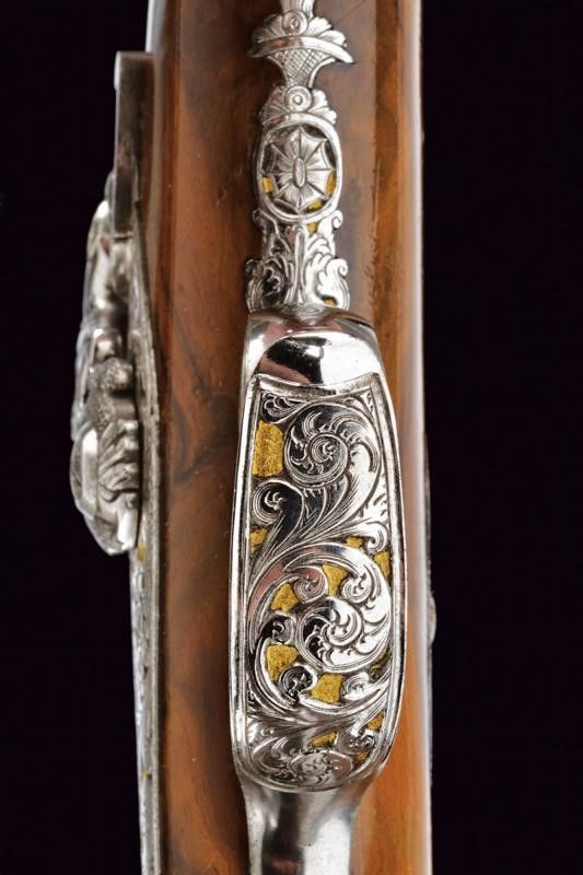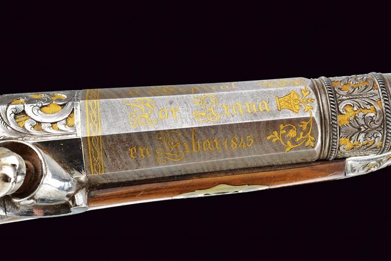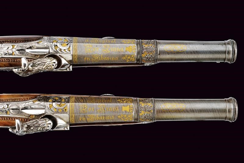 1845 Canne lisce a due ordini, in fine damasco; la prima parte ottagonale e marcata in oro fra decorazioni floreali à Espiral por Arana en Eibar 1845, la base intagliata a riccioli incisi su fondo dorato, al cambio una banda intagliata a motivi floreali su fondo dorato con cornice ad anelli lavorati a tacche per fingere il tortiglione; la seconda parte tonda recante il monogramma L.F.A. in oro racchiuso in cartiglio, la volata a cannoncino, decorata con la stessa cornice, cal. 17 mm in volata. Lunghe codette decorate en suite e con traguardo a sella. Batterie a molla indietro finemente incise a fogliame su fondo dorato, i cani intagliati e traforati a effigiare un leone che poggia su un piccolo drago. Casse in radica a tre quarti con calci intagliati a motivi floreali e geometrici, fornimenti in acciaio decorati con gli stessi bellissimi motivi; grilletti bruniti, cocce con anello di sospensione. Bacchette in corno con cavastracci e battipalla in metallo.