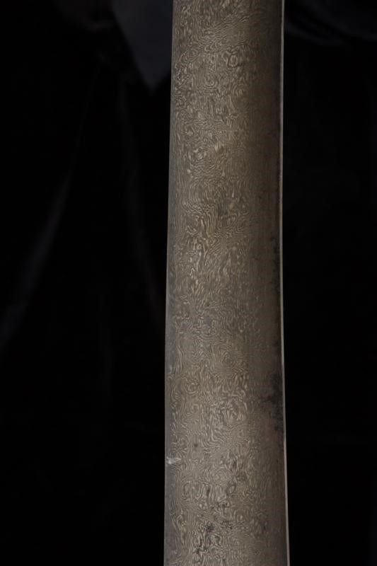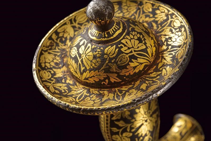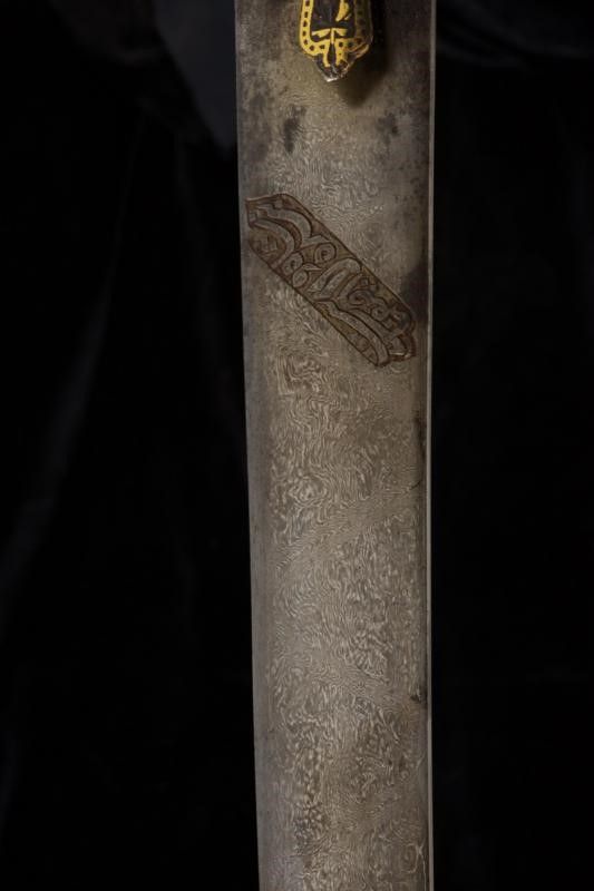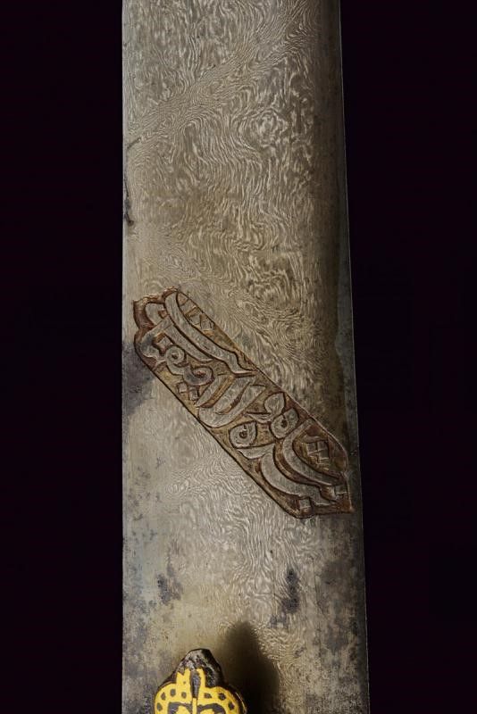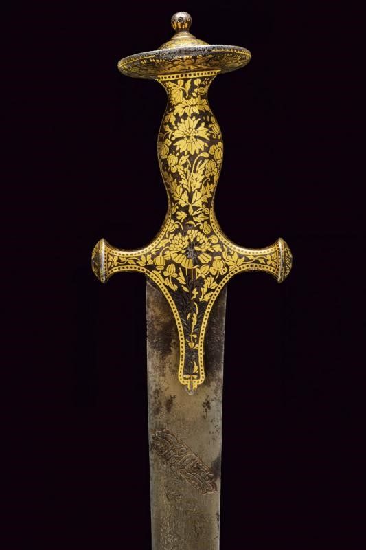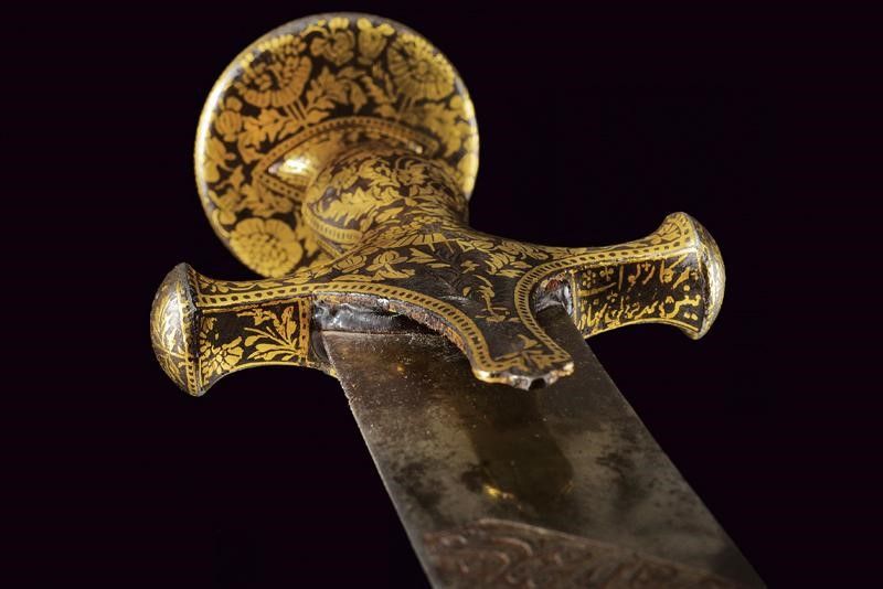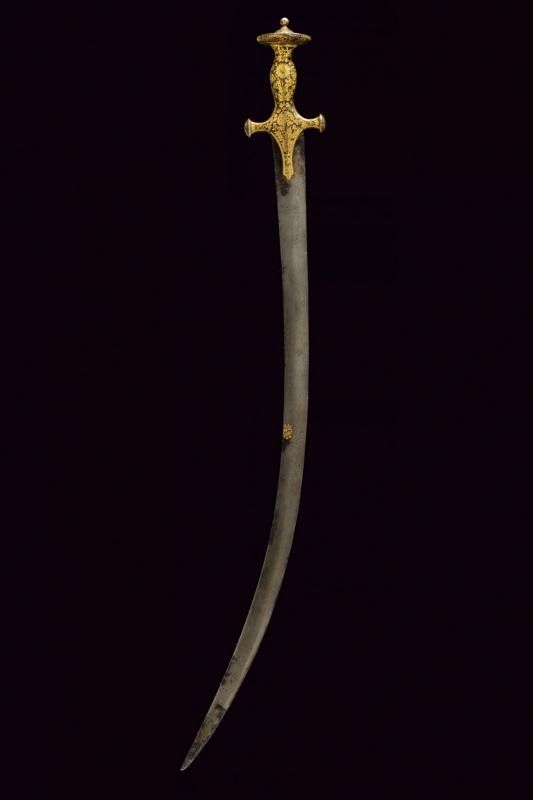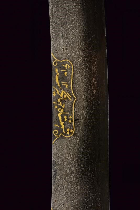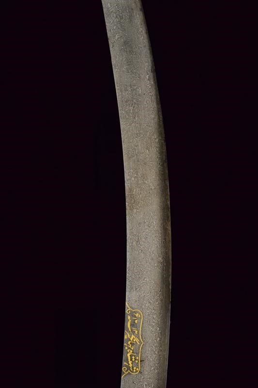 India Moghul, lunghezza 91.5 cm. primo quarto del XVII Sec. Lama piatta curva, a un filo, in stupendo damasco a Scale di Maometto (o Kirk Narduban), realizzato non in modo tradizionale ma a scale oblique (molto piω rare); alcune zone intaccate. Al centro del lato di terza un cartiglio in oro con iscrizione in caratteri arabi Shehanshah Jahangir Sunh e la data 1012. La base della lama incisa obliquamente Bandah e Shah Wiltyat Esfahani, altri due cartigli decorati in oro a motivi floreali ed un terzo cartiglio sul lato opposto. Bellissimo fornimento in ferro, decorato finemente con incisioni floreali rimesse in oro giallo (alcune mancanze). Sotto ad un braccio dell'elso la firma Sarkar Nawab Yunsen Muhammad Khan.