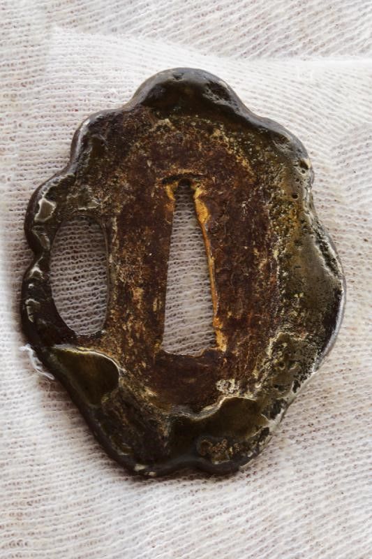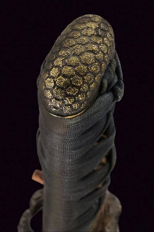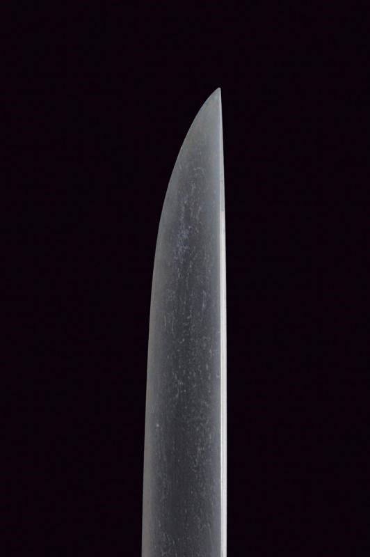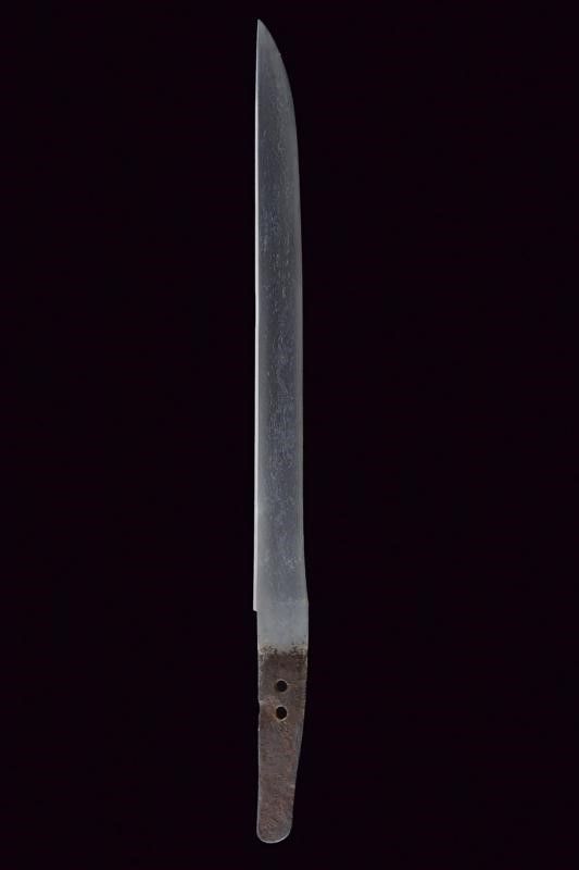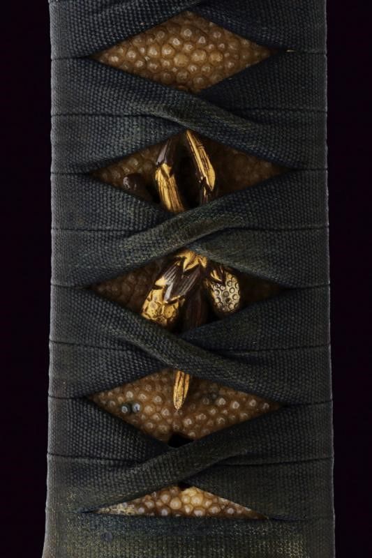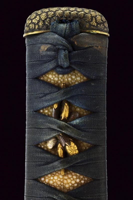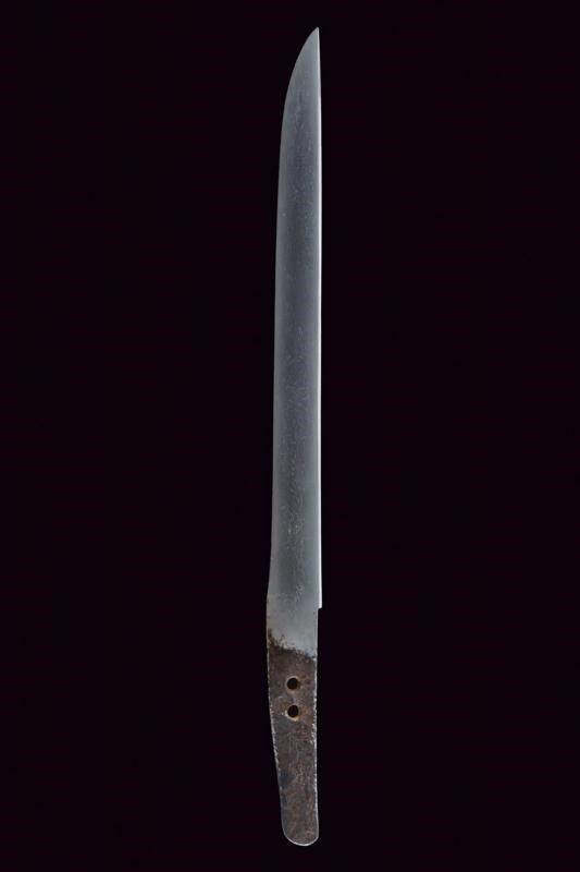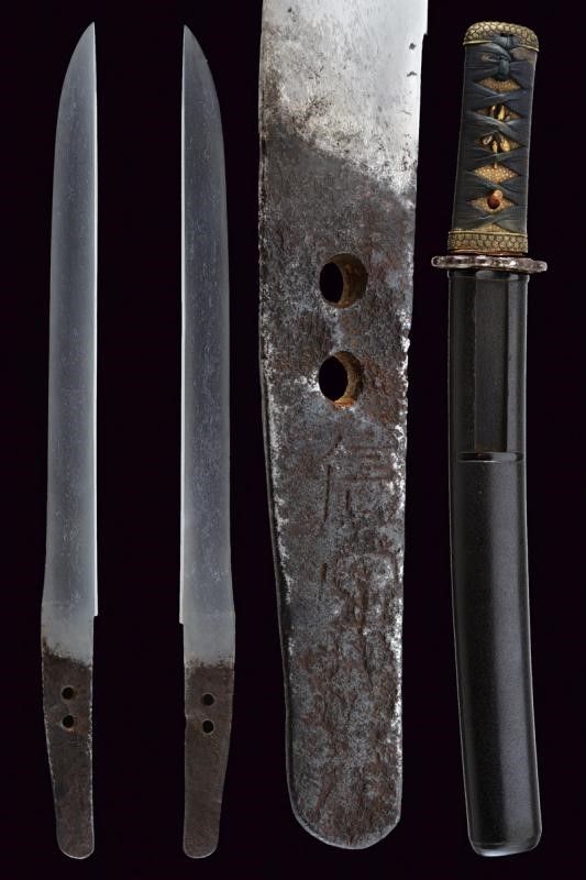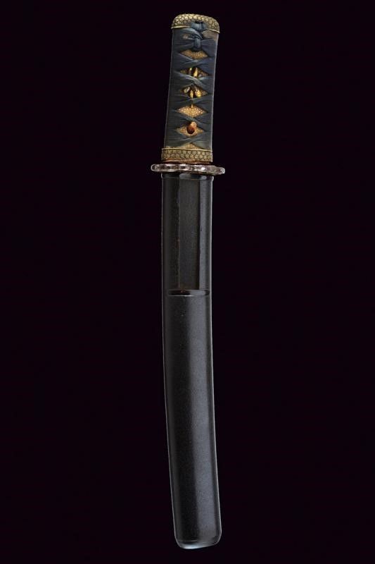 Giappone, lunghezza 40 cm. Periodo Edo (1603-1867) Lama Hira-zukuri a un filo, Iori-mune. Nagasa: 26,5 cm. Mei: Nobukuni. Habaki in rame. In koshirae con piccola Tsuba in ferro. Fuchi e Kashira in ottone con decoro a nido d'ape. Menuki parzialmente dorati. Tsuka con vecchia allacciatura. Saya laccato nero con lievi segni d'uso e del tempo.