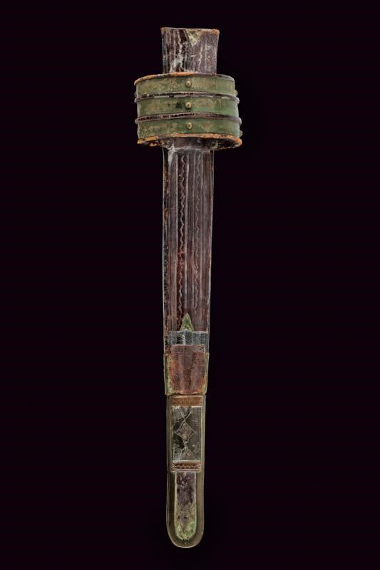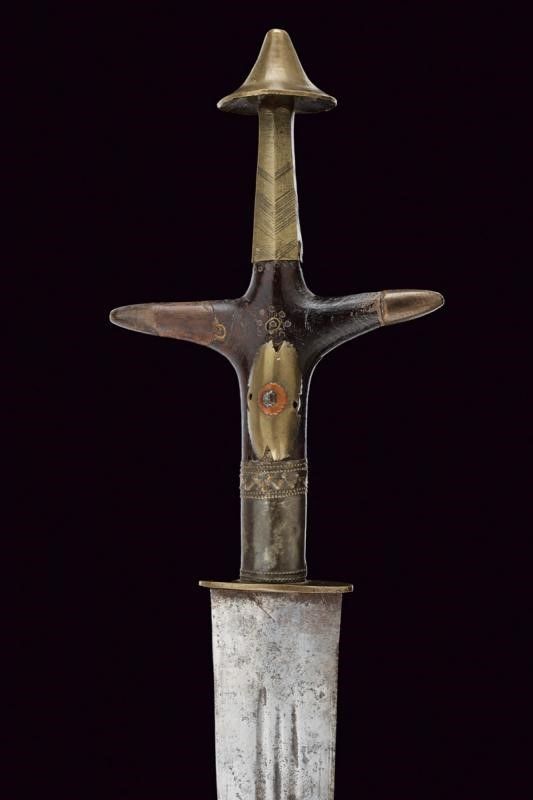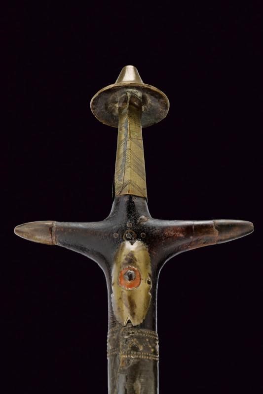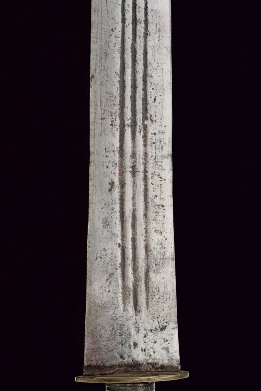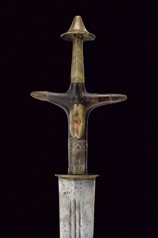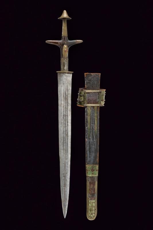 1900 circa Larga lama dritta a due fili con triplice scanalatura, tipica impugnatura a croce in legno, fornimenti in diversi metalli. Completa di fodero in cuoio con fornimenti in metallo ed anello per il braccio.