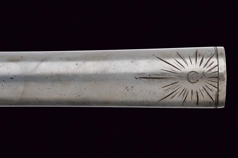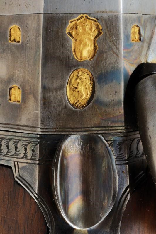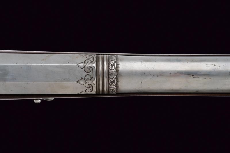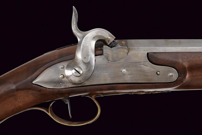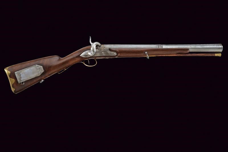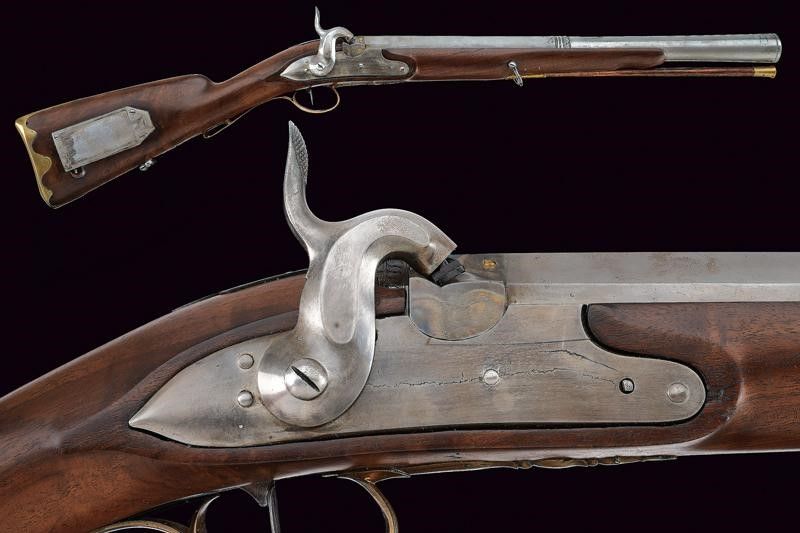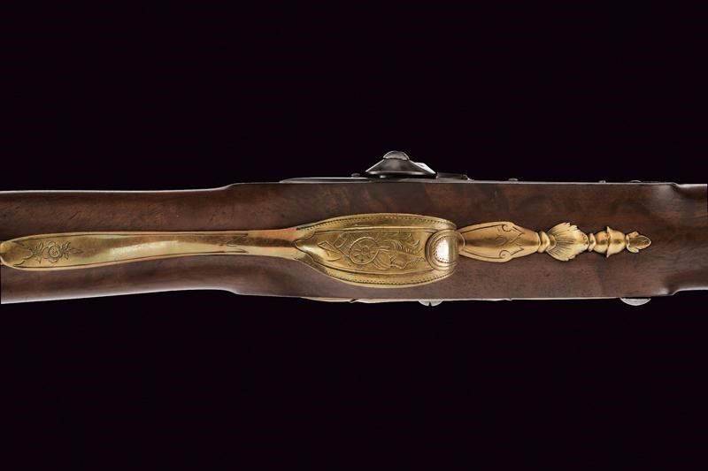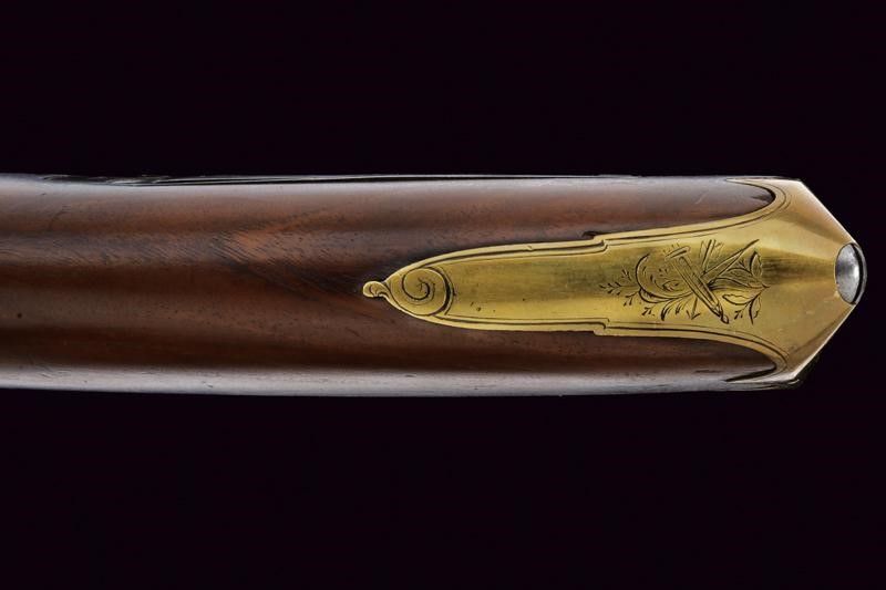 Piemonte, lunghezza 92 cm. Secondo quarto del XIX Secolo Canna liscia a due ordini, ottagonale e tonda, con cornicette a foglie d'acanto e anellature al cambio. Il blocco di culatta con punzoni sabaudi rimessi in oro. Il codolo con traguardo a sella. La volata leggermente strombata, con incisione a mezzaluna attorniata da raggi al dorso, cal. 27 mm. Batteria a luminello (crepa al centro della cartella), con meccanica funzionante. Cassa a tre quarti in legno. Fornimenti in ottone parzialmente incisi. La pala con patchbox in ferro sul lato destro. Restauri. Bacchetta in legno con battipalla in ottone.