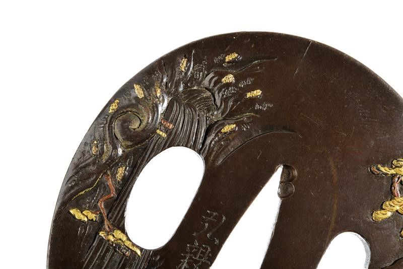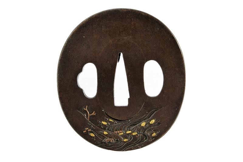 Giappone, dimensioni 5,9 x 6,4 cm. Periodo Edo (1603-1867) In shibuichi, di forma Naga-maru-gata. Ben lavorata ad intaglio con effige di un saggio che ammira un paesaggio montano con una cascata (forse Li Bai). Sul retro intaglio di un torrente. Su entrambe le facce vari dettagli ageminati in oro e rame. Nakago Hitsu-ana 2,4 cm. Probabilmente tarda Epoca Edo, inizio XIX secolo. In Kiri-box.