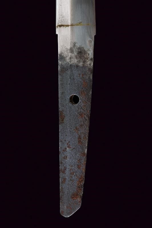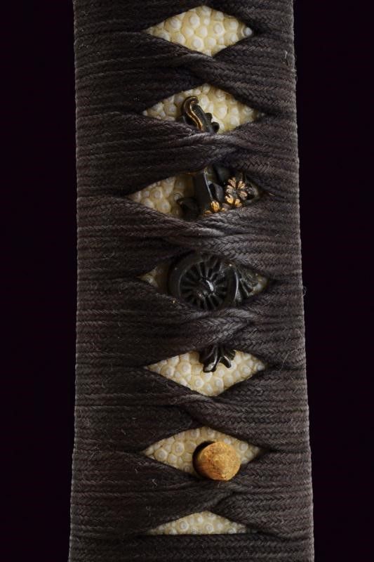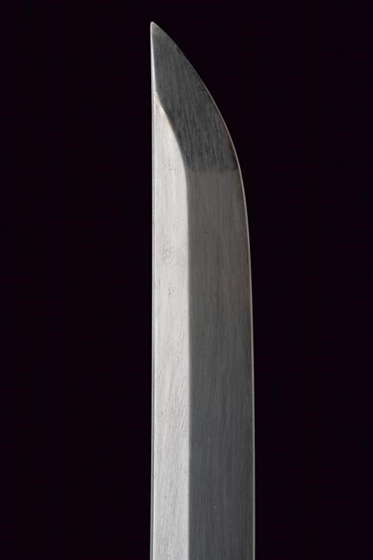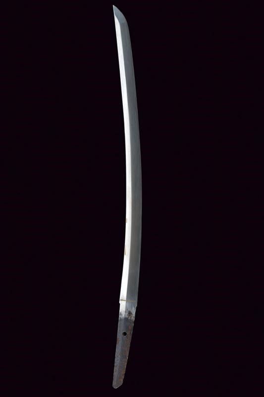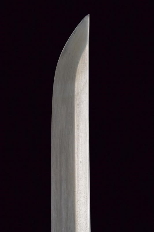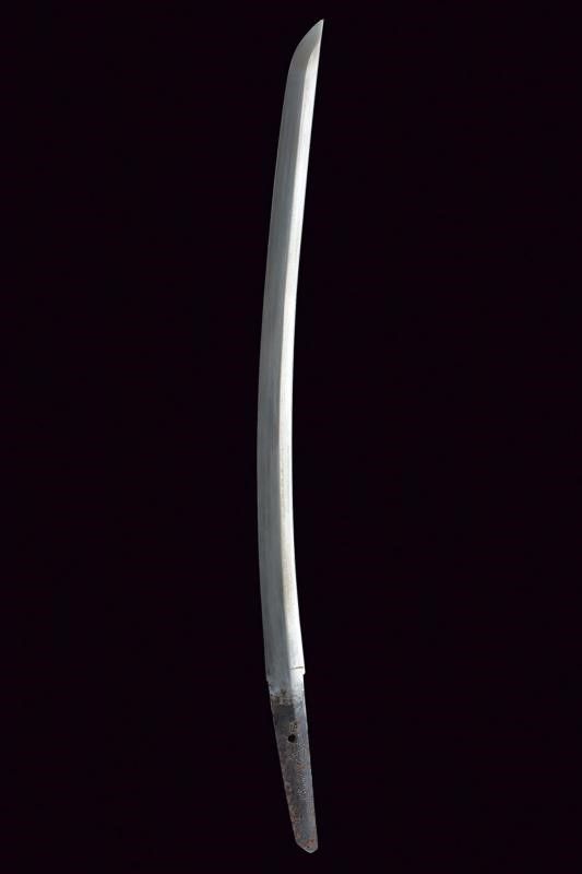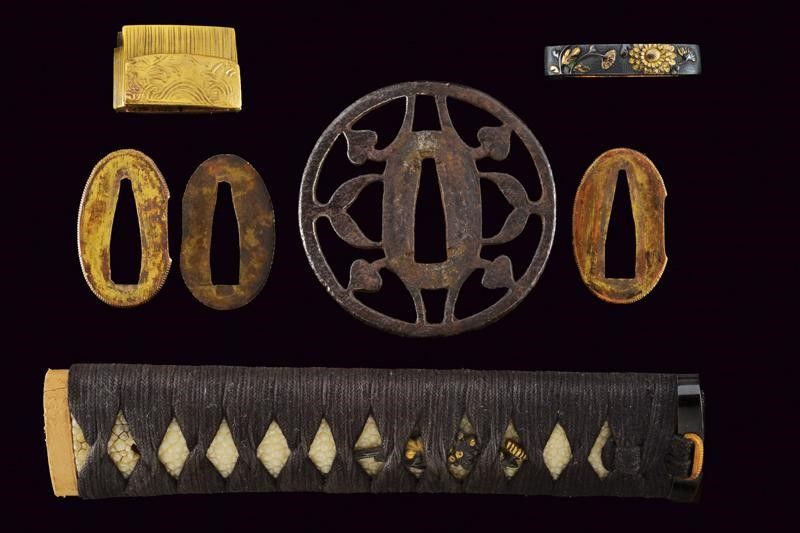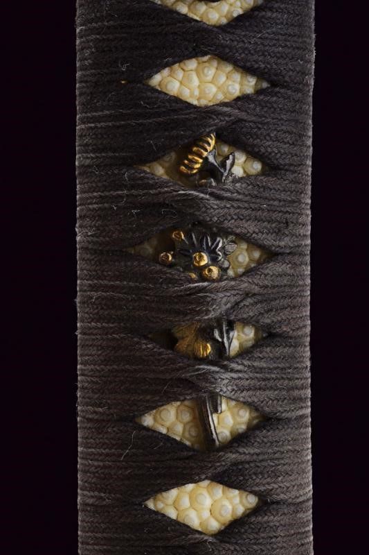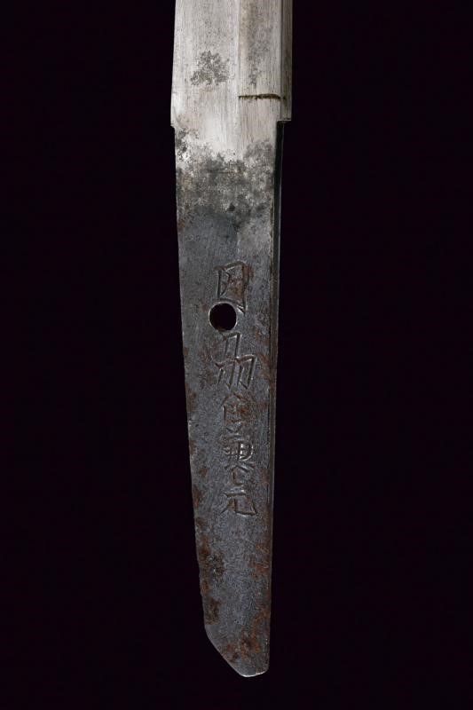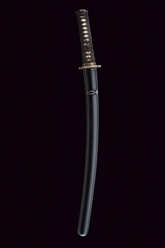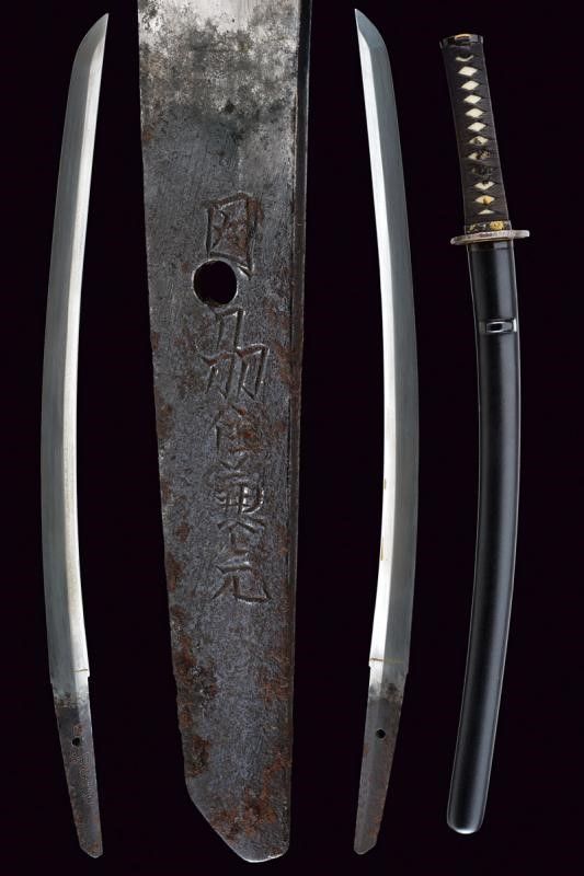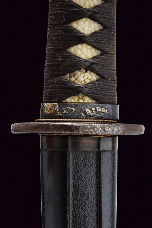 Giappone, lunghezza 64 cm. Periodo Edo (1603-1867) Lama Shinogi-zukuri, Iori-mune . Nagasa: 46,7 cm. Hamon e hada non visibili. Nakago-jiri: Iriyamagata. Mei: Inshu ju Kanesaki. Un Mekugi-ana. Epoca Shinto XVII-XVIII secolo. Provincia di Kaga. Habaki in ottone a due lamelle con decori a nuvole all'esterno. In koshirae con Tsuba Maru-gata d'epoca Edo, in ferro traforato. Fuchi in Shakudo Nanako con fiori dorati in rilievo, Menuki sempre in rilievo con elementi dorati. Tsuka con same e Tsuka-ito forse più tardi. Kashira in corno bruno. Saya in legno laccato nero.