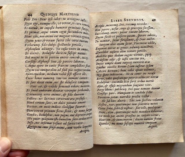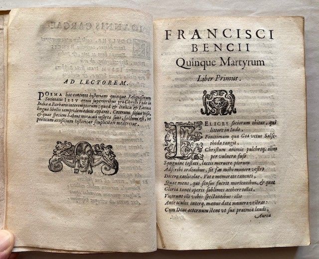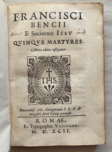 Seconda edizione (edita per la prima volta l'anno prima, 1591), molto rara, di questa raccolta di poesie sui martiri gesuiti in India di F. Benci (1542-1594). L'opera è dedicata al cardinale Aquaviva, fratello di uno dei martiri, Rodolfo Aquaviva.