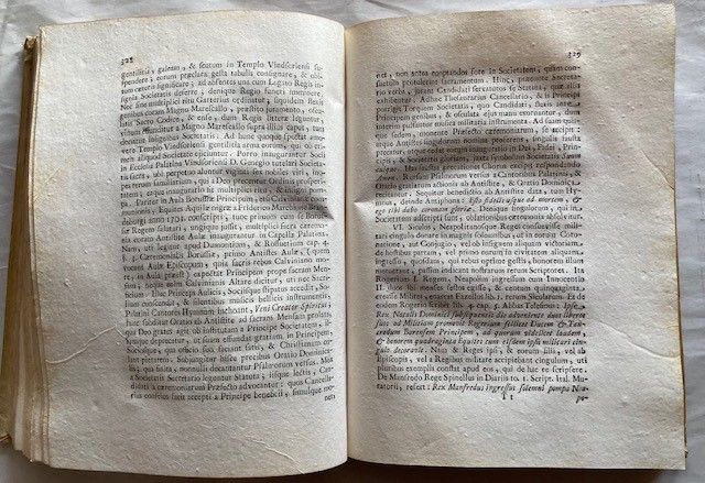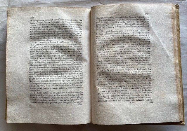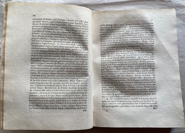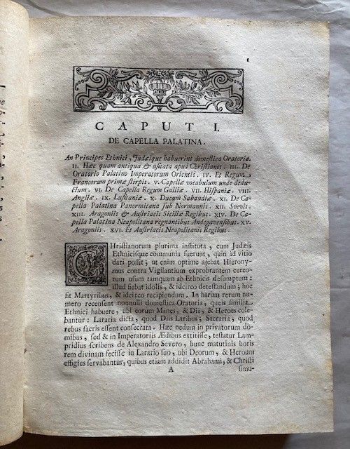 Prima edizione di un'opera importante e rara. Si tratta di un interessante trattato dedicato alle prerogative e ai privilegi circa le cappelle e il clero palatino nel Regno delle due Sicilie. La Cappella Palatina sorge nel Palazzo Reale di Palermo, anche noto come il Palazzo dei Normanni, essendo un capolavoro del periodo della dominazione normanna. L' Autore descrive quindi l'edificio, la fondazione, il clero, i privilegi, i riti e le liturgie della Reale Cappella Palatina, nonché gli onori che toccano in chiesa ad alcuni principi per concessione pontificia. (Mira I, 174; Narbone I, 285; Dura, 2864; Lozzi, 5018 cita l'edizione 1772).