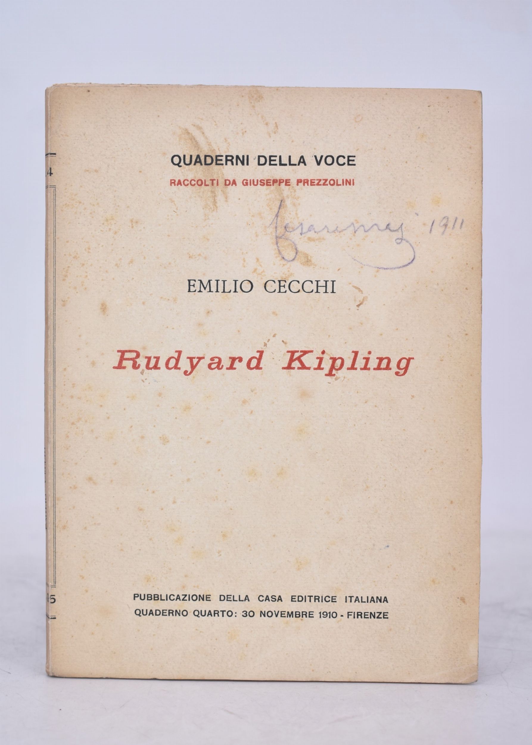 Prima edizione, collezione Quaderni della Voce. Edizione priva di frontespizio, con un ritratto di Kipling f.t. Esemplare con segni di matita nel testo, una firma di possesso al piatto.