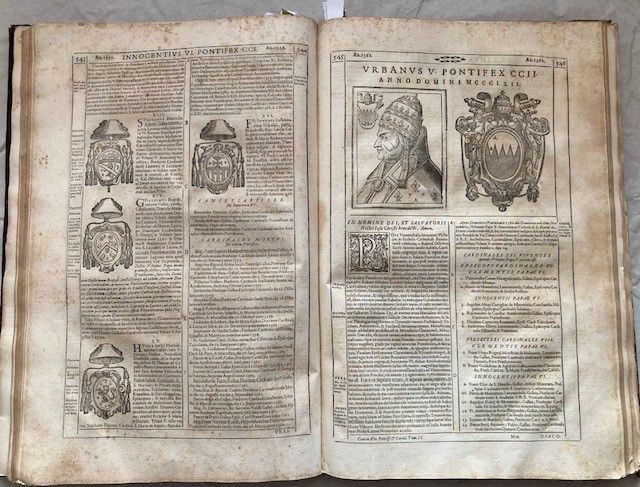 Folio (cm 41,5x27), 4 grandi volumi con legatura coeva in vitello marrone, dorsi dorati con titoli in oro su etichette in vitello rosso (abbastanza usurati agli angoli e testa/piede dei dorsi con mancanze della pelle), internamente in parti più o meno brunite per qualità propria della carta, più carte o fascicoli sciolti o parzialmente sciolti. Titoli in rosso e nero, ciascuno con incisione a mezza pagina, quasi 2.000 xilografie nel testo raffiguranti ritratti di papi e cardinali, e i loro stemmi, ma anche sigilli, monete, medaglie e quasi 50 tavole incise. Centinaia di pagine, articolo non fascicolato, venduto così com'è, LOTTO NON SOGGETTO A RESO.