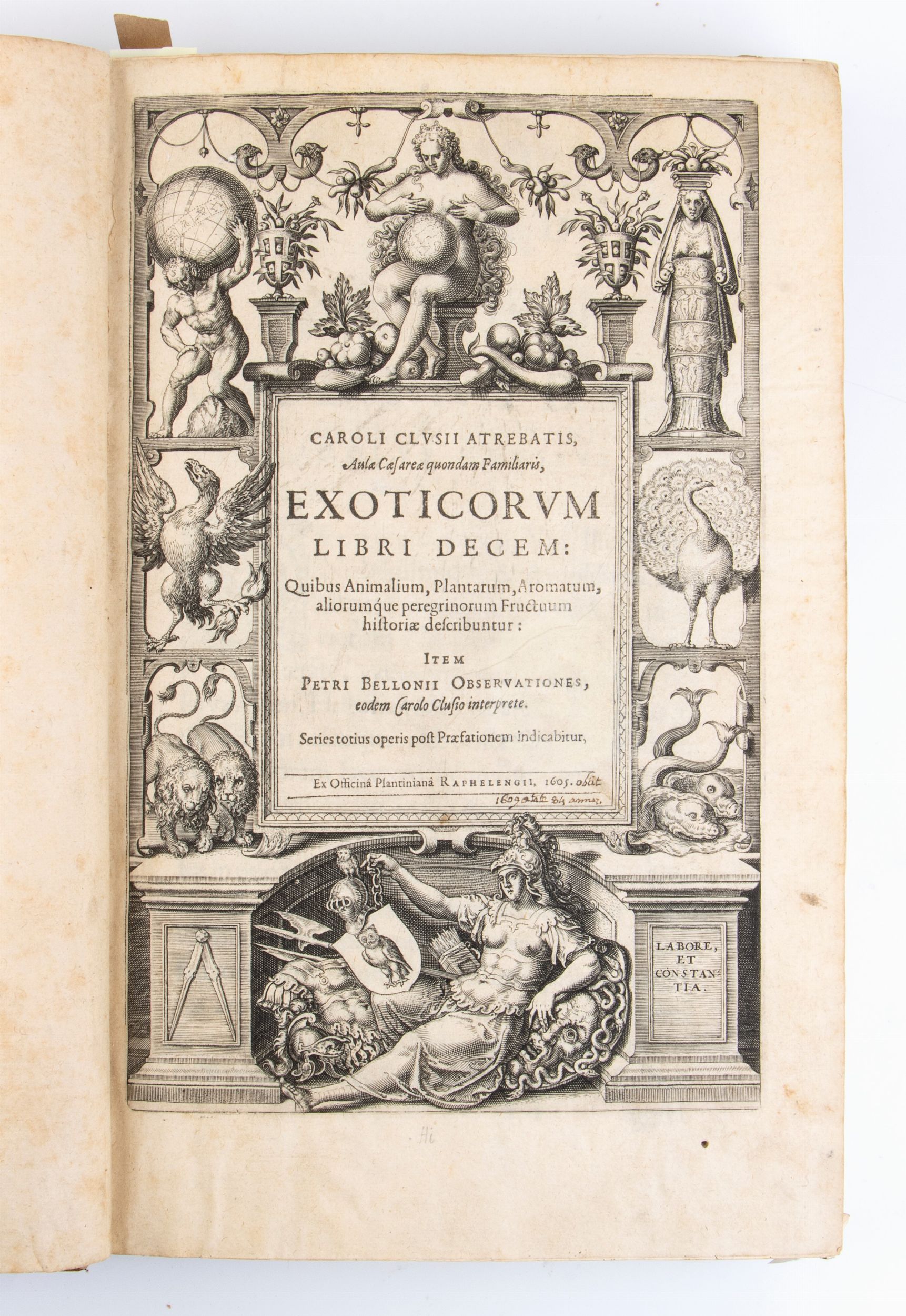 PRIME EDIZIONI delle pionieristiche opere zoologiche e botaniche di Clusius. Il primo, nella sua variante testuale piĂ¹ completa, presenta l'indagine di Clusius sulle raritĂ di flora e fauna prevalentemente extraeuropee e comprende le sue traduzioni latine abbreviate di scritti di Garcia da Orta, NicolĂ¡s Monardes, CristĂ³vĂ£o da Costa e Pierre Belon. Le Curae posteriores, che comprendono voci aggiuntive al Rariorum Plantarum di Clusius, si trovano qui nell'edizione in folio e non in quella in quarto dello stesso anno. «PiĂ¹ e piĂ¹ volte, nel tentativo di accertare la corretta applicazione dei nomi dati da Linneo, il ricercatore è ricondotto all'opera di L'Ecluse, che puĂ² essere descritta come il punto di partenza della nostra conoscenza moderna per molti generi. La sua descrizione e le illustrazioni associate aiutano quindi a caratterizzare la specie degli autori successivi.