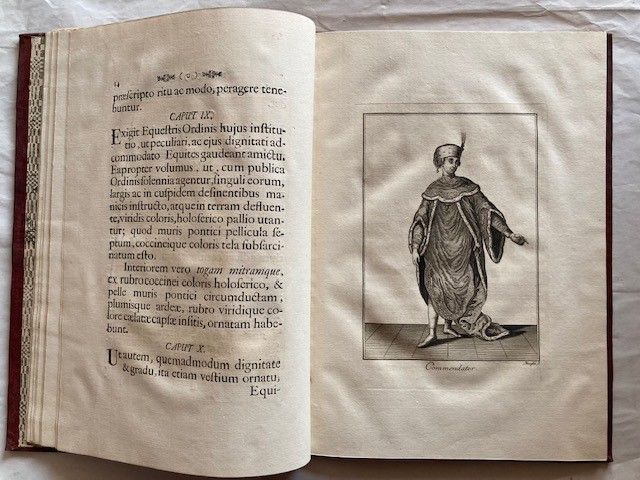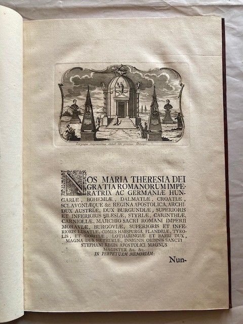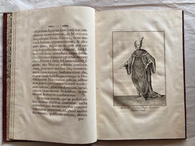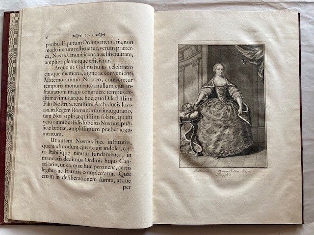 Tavola incisa raffigurante le medaglie dell'ordine rilegate prima del titolo stampato, grande vignetta incisa di Santo Stefano al titolo (120 x 155 mm), grande intestazione incisa al 2° foglio (92 x 150 mm), ritratto inciso a piena pagina di Marie Teresa d'Austria, 3 ritratti incisi a piena pagina di cavalieri di Santo Stefano in abiti da parata, 1 tavola incisa a tutta pagina raffigurante la corona e la collana dell'ordine (queste stesse illustrazioni sono ripetute nella versione tedesca). Pp. 35 (1 vuoto), pp. 33, (1 vuoto). Lipperheide II, 1913.