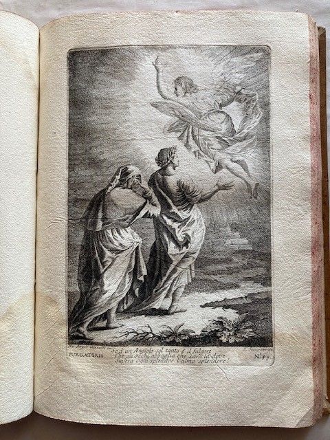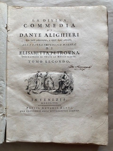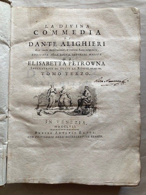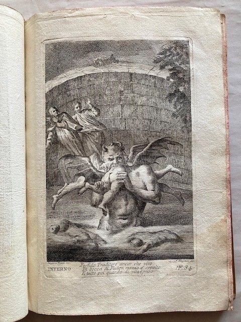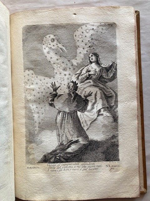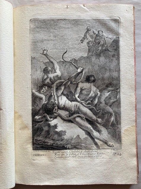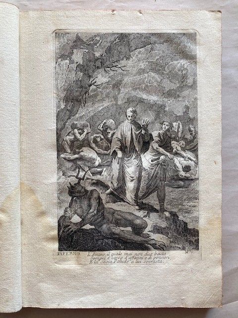 Ritratto inciso di Dante, complessivamente 107 tavole incise, di cui: 33 su 34 nell'Inferno (in quanto manca la tavola n. 6), 33 nel Purgatorio, e 31 nel Paradiso (la numerazione non presenta interruzioni ma evidentemente ne mancano 2) , piĂ¹ 7 tavole aggiuntive di cui una ripetuta. Sembra che si tratti di una riedizione delle tavole originali, ora numerate (la numerazione delle tavole non compare nell'edizione originale). Le tavole sono incise da: Gaetano Zompini, Giuliano Giampiccoli, Francesco Fontebasso, Gasparo Diziani, Bartolomeo Crivellari, Giuliano Zuliani, Jacopo Guarana ed altri. Un insieme quasi completo delle illustrazioni incise della piĂ¹ famosa edizione dantesca del XVIII secolo. Morazzoni 255. De Batines I, 112. Koch I, 1. Mambelli 65: «Stimata edizione». Gamba,396: Edizione fatta con lusso.