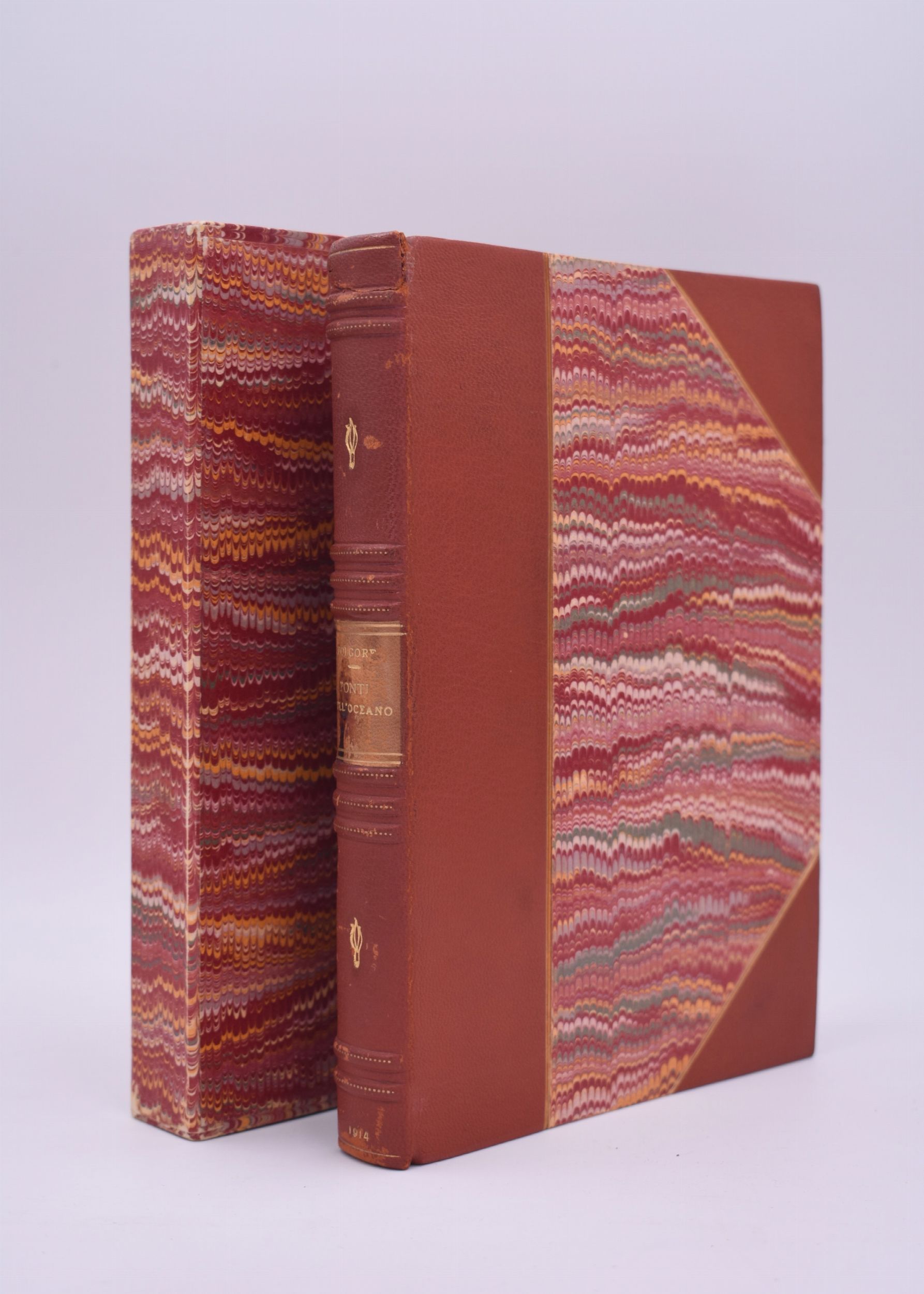 Prima edizione dell'opera futurista di Luciano Folgore. Esemplare conservato in pregiata legatura artistica in mezza pelle marocchino (mm. 204x145) con la brossura conservata e custodia marmorizzata.