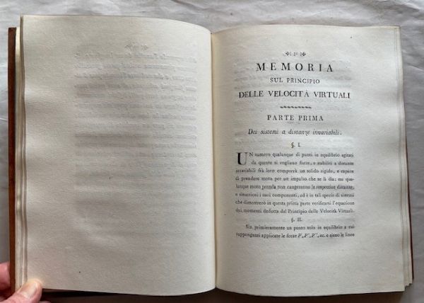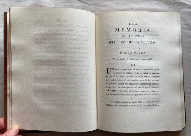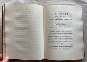 Seconda edizione, piĂ¹ rara della prima, di queste memorie fisico-matematiche in cui si approfondiscono e sviluppano le ricerche intorno alle velocitĂ virtuali da Galileo a Lagrange, dalla cui Mecanique Analytique l'autore si ispira e professa il suo debito scientifico. Lo sforzo principale del Fossombroni è di tradurre la formulazione galileiana delle velocitĂ virtuali nel linguaggio algebrico del Lagrange e di applicarle a problemi pratici di idraulica, fornendo altresì la prima esatta dimostrazione del principio di Galileo. L'opera contiene anche esposizioni sull'idrodinamica di Bernoulli, sugli studi idraulici di d'Alembert ed Eulero e sulla Nuova Architettura idraulica di Prony.