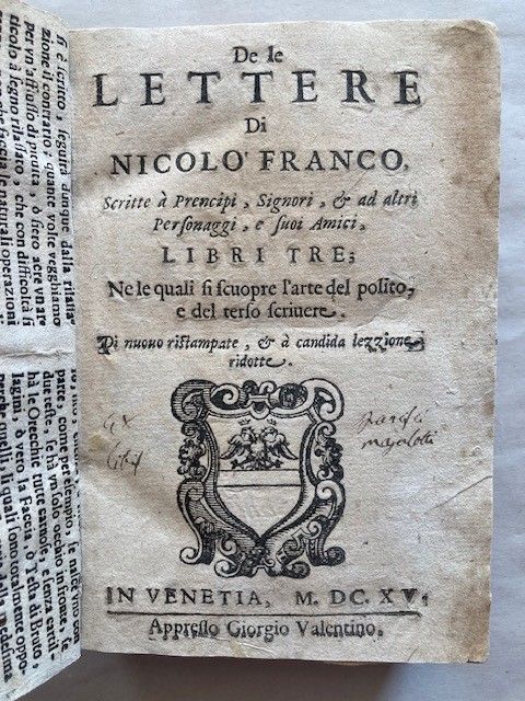 Rara edizione della raccolta di lettere del poeta (impiccato nel 1570 a Roma per ordine del Papa), amico e poi nemico di Pietro Aretino. Le lettere sono disposte cronologicamente e vanno dal 1531 al 1538. Tra i destinatari delle lettere troviamo il re di Francia Francesco I (molte lettere), il duca e la duchessa di Urbino, gli umanisti Daniele ed Ermolao Barbaro, Paolo Manuzio, Agostino Ricchi, Francesco Alunno, Francesco Veniero, il pittore Tiziano (fol. 117v), Federico Badoer (fondatore dell'accademico letterario per il quale Paolo Manuzio stampò diverse edizioni alla fine del 1550, tutte elencate da Renouard).