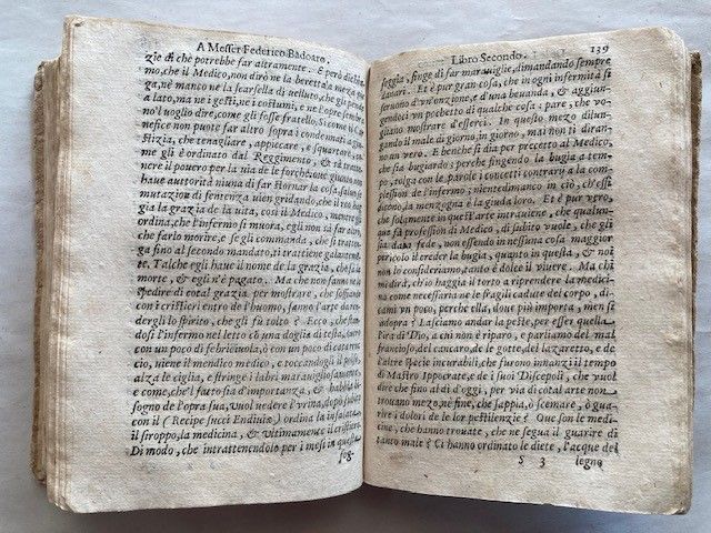 In 8° (il foglio 143x95 mm), cartone veneziano coevo a carta rustica, dorso rivestito successivamente da carta colorata, carte di guardia con frammenti presumibilmente seicenteschi, edizione dell'opera di Della Porta sulla Fisiognomica, complessivamente copia autentica (6 fogli ancora non aperti). Piccola marca xilografica sulla copertina, pp. [6], 256 [i.e. 258, la prima numerato erroneamente 5, come citato dalla SBN italiana].