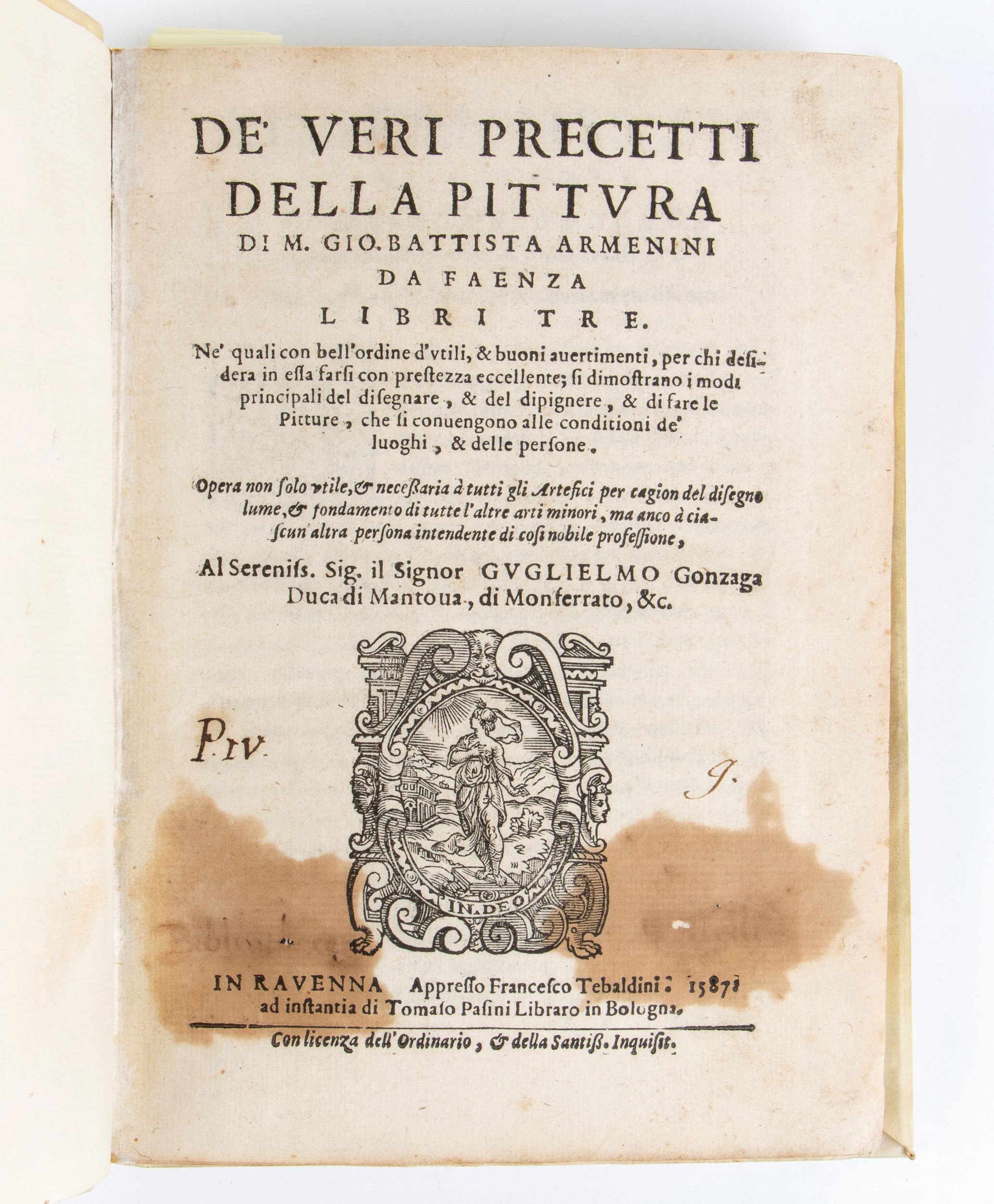 De' veri precetti della pittura di Giovan Battista Armenini da Faenza libri tre. Ne' quali con bell' ordine d' utili & buoni avvertimenti, per chi desidera in essa farsi con prestezza eccellente; si dimostrano i modi principali del disegnare, & del dipingere, & di fare le Pitture, che si convengono alle conditioni de' luoghi, & delle persone. Opera non solo utile, & necessaria di tutti gli Artefici per cagion del disegno; lume & fondamento di tutte l' altre arti minori, ma anco Ă ciascun' altra persona intendente di cosi nobile professione