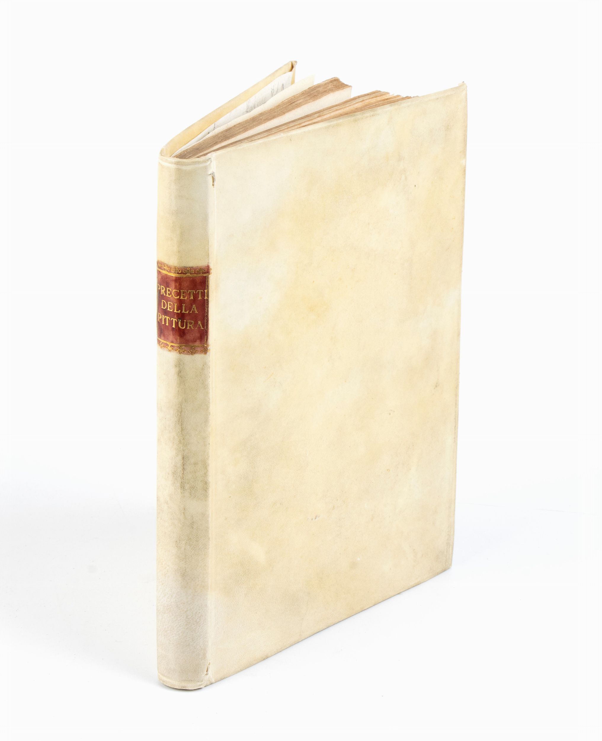 Legatura in pergamena del xx secolo con titolo su etichetta rossa al dorso