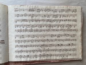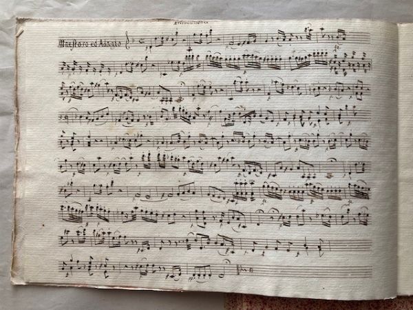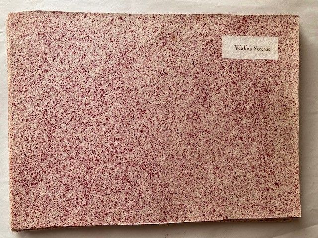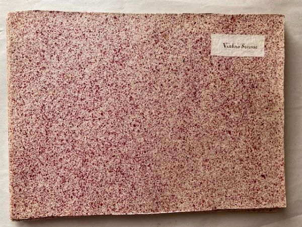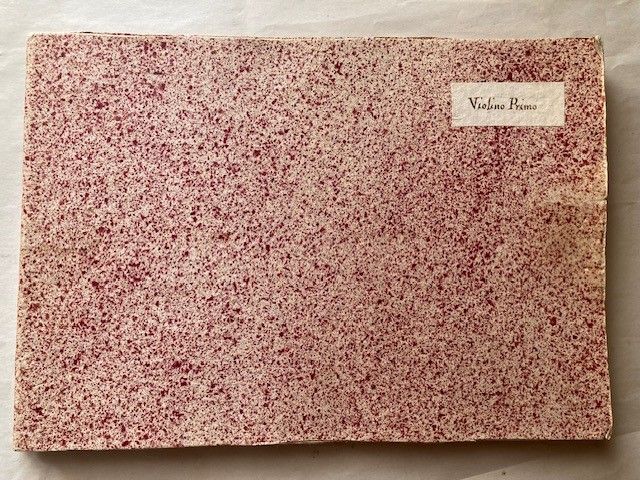 Manoscritti musicali su carta; in 4° oblungo (215x305 mm); ff. [6], [6], [6], [6]; quattro raccolte nei piatti originali ricoperti di carta rosa “mouchetè” dell'epoca, con etichette cartacee incollate su ogni album (Violino primo, ecc, manca un'etichetta); conservato nel cofanetto originale in cartone, rivestito con carta simile (colorata in verde); tutti gli album in ottime condizioni.