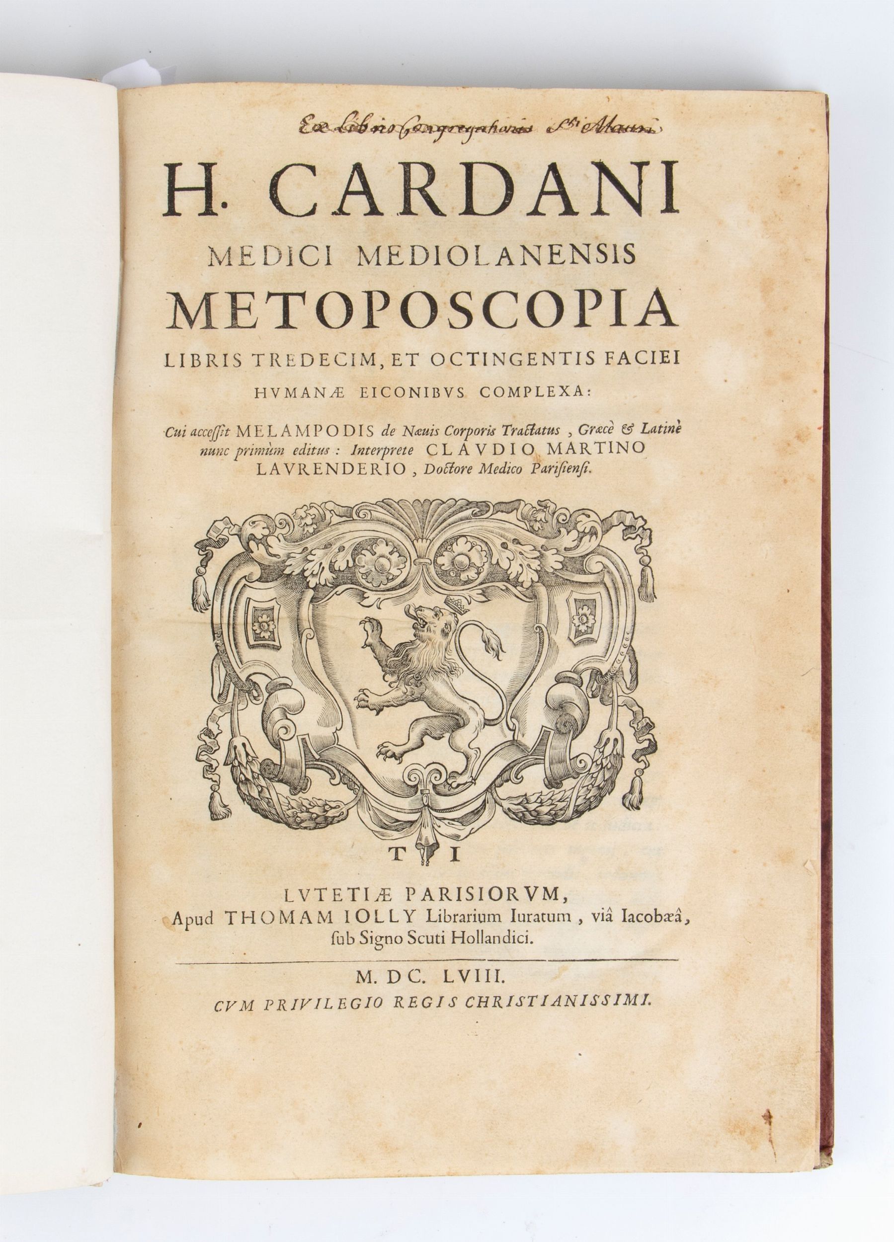 Prima edizione postuma, apparsa contemporaneamente anche in francese. Notevole trattato cinquecentesco di fisiognomica e frenologia rimasto inedito per oltre un secolo illustrato con 800 figure xilografiche delle quali 3 a piena pagina. Comprende in fine anche il trattato sui nei con testo originale greco e traduzione latina di Melampus, autore del III secolo.