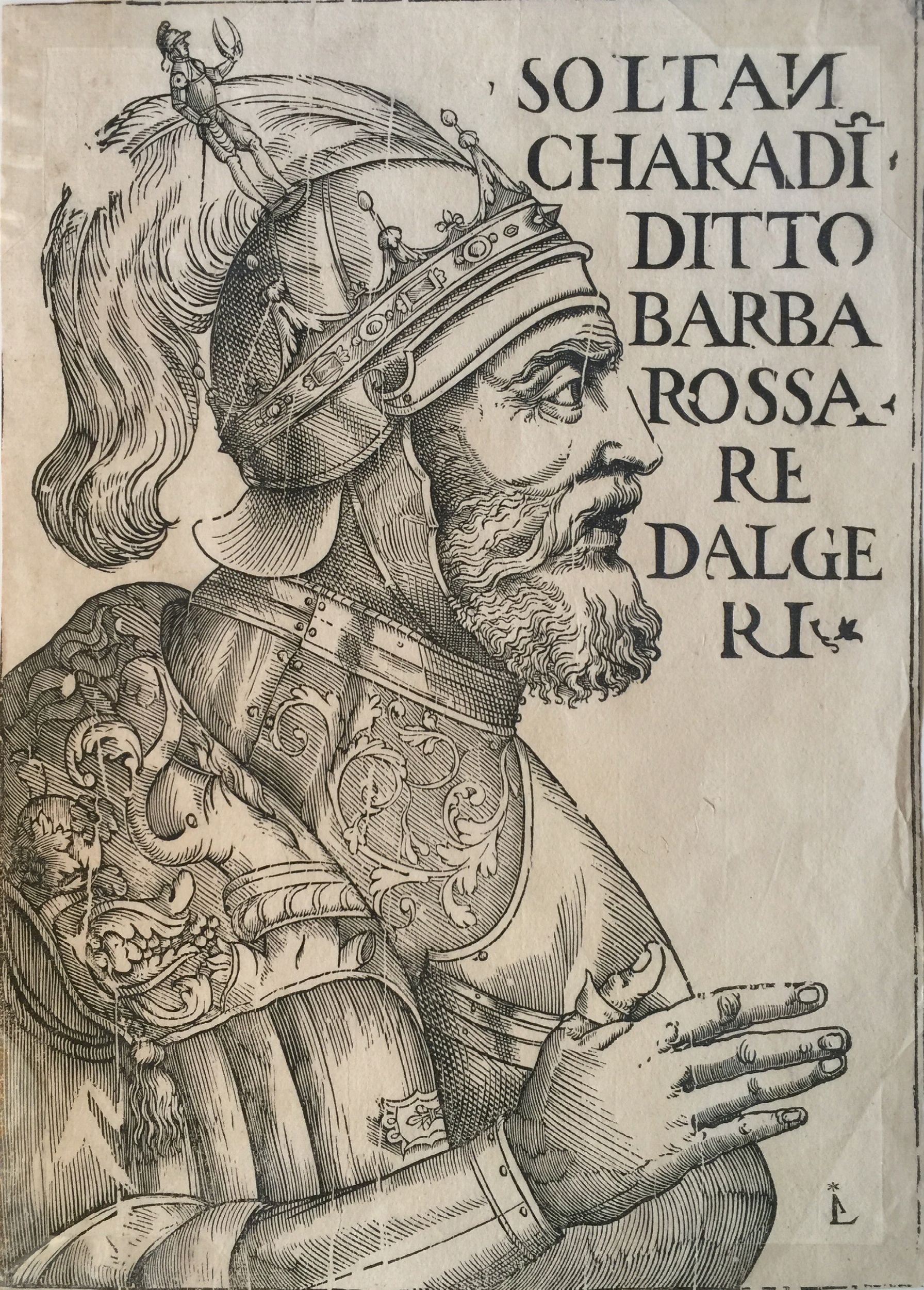 Xilografia su carta, mm. 351 x 253, stampata nel XIX sec. su carta antica (con filigrana simile a mezzaluna) dalla matrice in legno della prima metà del XVI sec., probabilmente allora appartenuto alla famiglia di tipografi Soliani di Modena (Italia), che possedeva una collezione di blocchi antichi. Nell'angolo in basso a destra c'è un monogramma 'LA' tagliata sulla matrice per falsificarne la paternità, attribuendolo a Luca Antonio degli Uberti (att. 1503-1557), vedi Clelia Alberici in 'Achille Bertarelli, Stampe popolari italiane', Milano 1974. Stampa comunque molto rara ed in ottime condizioni.