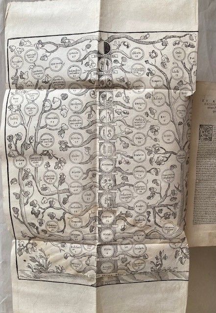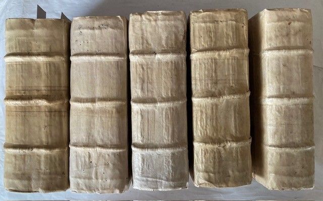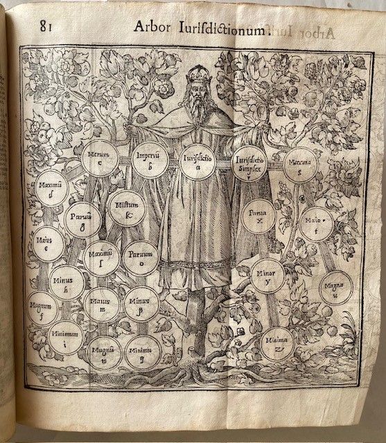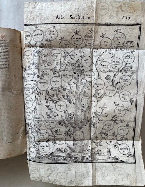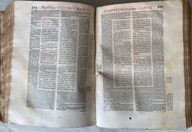 In 4° (cm 25,5x18) 5 volumi in pergamena coeva, dorsi ricoperti con pergamena antica, qualche leggera gora agli angoli inferiori (soprattutto al vol. III), angolo superiore della quarta di copertina nel vol. III del Digestum usurato, per il resto ancora in discrete condizioni. Titoli e testo stampati in rosso e nero, ogni titolo con marchio xilografico, pp. 1509, 1388, 1327 + indici in ogni vol., con 2 tavole xilografiche pieghevoli nel vol I (arbor giurisdizione e arbor servitutum), uno nel vol. II (arbor substitutionum) e uno nel vol. III (arbor ?'). Codice: [36] c., 2640 col., [28]. Istituzioni: [40], 383, [1] p. (5 volumi nel lotto)