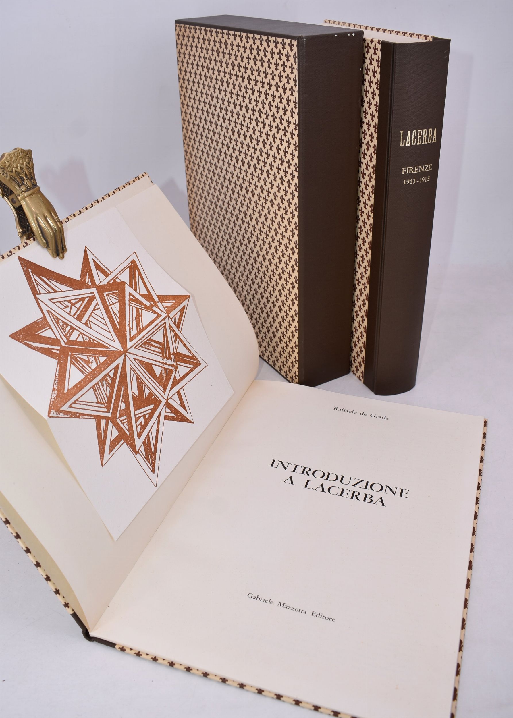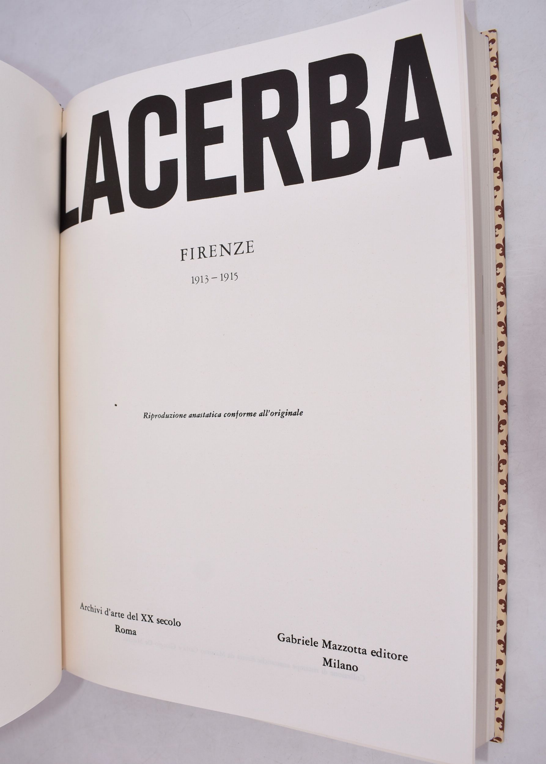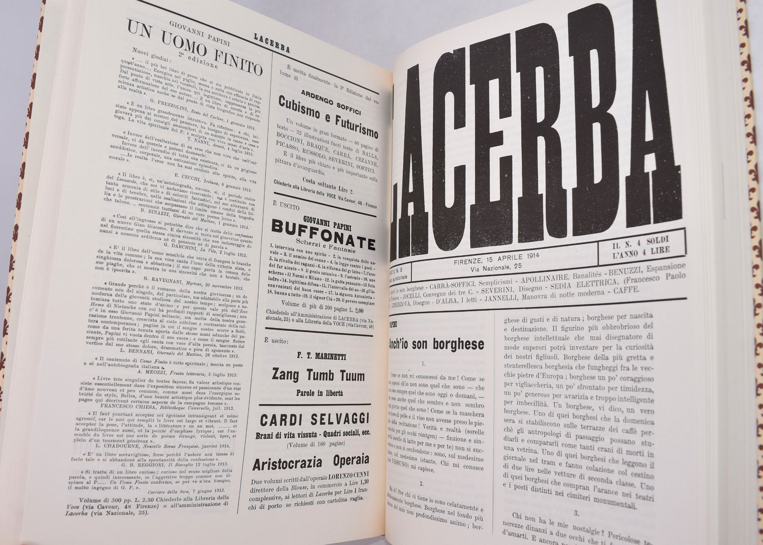 Due volumi illustrati, il primo contenente la āRiproduzione anastatica conforme all'originaleā della pubblicazione futurista fondata da Giovanni Papini e Ardengo Soffici, con interventi dei due fondatori, di Palazzeschi, Marinetti e moltissimi altri; il secondo volume propone un testo storico-introduttivo sull'opera ed ĆØ a firma di Raffaele Del Garda. Ed. numerata, es. n. 193/700. Legatura in mezza tela e carta decorata a gigli fiorentini, con cofanetto e scheda bibl. conservati.