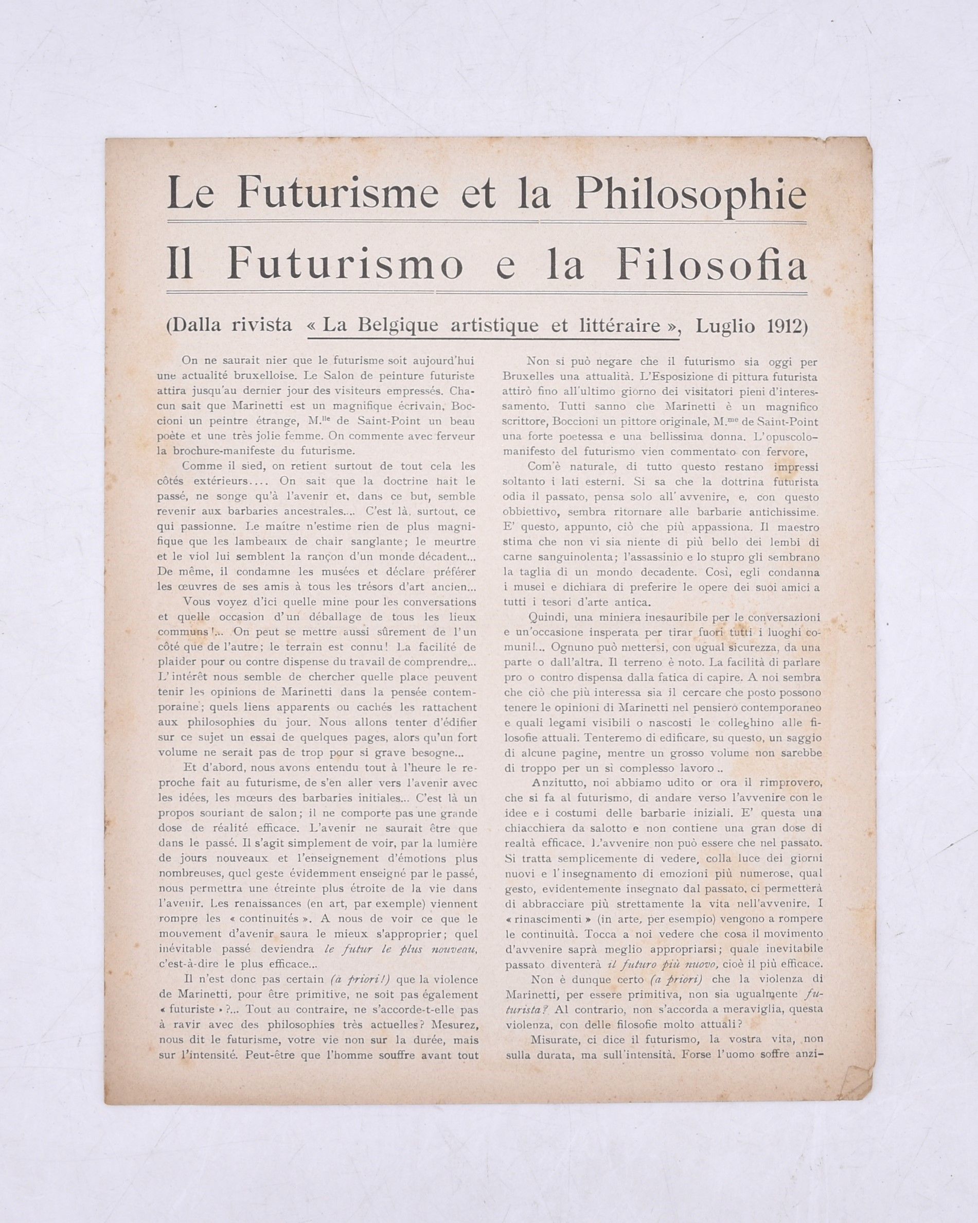 Direction du Mouvement Futuriste (Cart. Tip. A. Taveggia -S. Margherita), Milano. pp. [4], mm. 290 Ă— 230. Ciclostilato.