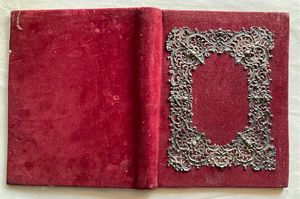 in folio piccolo, in velluto bordeaux con bella cornice cornice in argento sbalzato a mano.