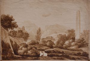 Secolo 18/19°, capriccio architettonico con obelisco e avanzi di acquedotto romano, abilmente acquerellato in [..]
